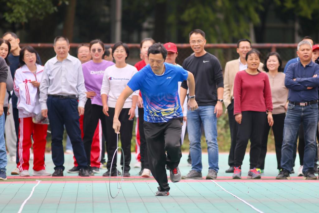 教职工趣味项目比赛在南区露天篮、排球场,北区田径场举行,共有21个单位、676人次参加。比赛在团结、友谊、欢乐的气氛中有序进行,包括滚铁环接力、跳绳、投篮接力集体项目,以及飞镖、50米吊瓶跑、龙凤戏珠、拾贝、飞盘掷准、木球比赛等趣味项目。(摄/胡伊脉、农屹骏、方晨旭、许腾跃、周潼、桂梦真、李毅、 廖雨欣、 吴志成、杜昀鸿)