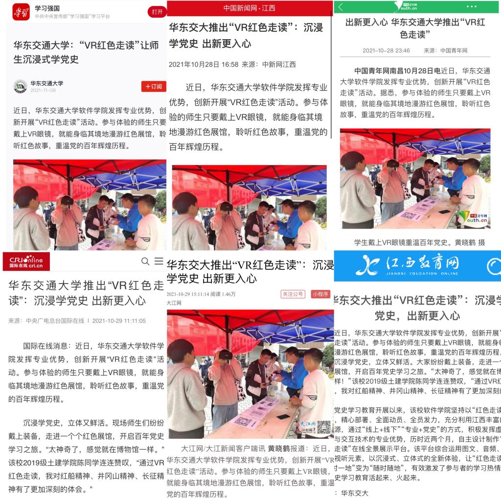 近日,软件学院发挥专业优势,创新开展“VR红色走读”活动。学习强国、中国新闻网、中国青年网、央广国际在线、大江网、江西教育网等12家媒体纷纷聚焦报道。现将原文内容转载如下: