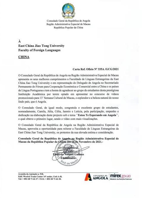 赛后,安哥拉驻澳门特别行政区总领事向beat365致函,感谢学校向世界展示安哥拉之美,并对获奖团队致以诚挚祝贺。