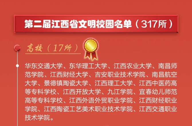 近年来,学校全面落实立德树人根本任务,以培育和践行社会主义核心价值观为主线,扎实推进精神文明建设,对标“六好”标准,坚持文明创建与事业发展同步、常态创建与长效机制并重、校园文明程度与师生文明素养共进,坚持把理想信念教育作为首要任务,把社会主义核心价值观贯穿育人全过程、融入日常各方面;以政治建设为统领,全面推进各级党组织建设;始终把师德师风作为教师评价的第一标准;坚持打造具有鲜明价值取向和鲜亮学校特色的校园文化;持续构建实用与审美相统一、生态与人文相协调的校园环境;始终把牢政治方向、价值取向、舆论导向,深入开展文明校园创建。先后获评江西省文明单位,省直机关文明单位,全省 “文明美丽校园”示范高校,全省高校平安校园示范学校,全国“学雷锋志愿服务基地”,创建江西省文明校园先进学校,创建全国文明城市工作先进单位,连续18年荣获江西省社会治安综合治理先进单位。