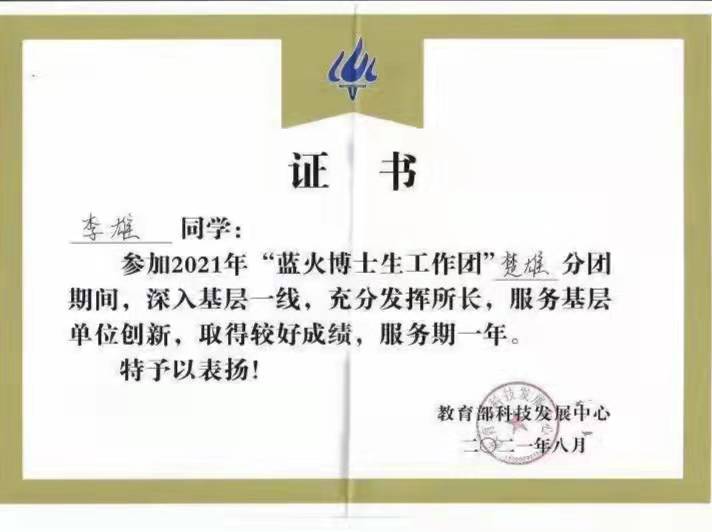 服务期间,李雄博士被选派到楚雄州开展技术服务,他充分发挥专业技术特长,积极协助企业解决技术难题,提供技术服务,开展专业技术讲座,指导企业项目申报,积极牵头为企业建立专家工作站,有力促进了企业的技术创新和转型升级,得到了当地政府和企业的一致好评。