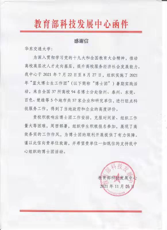 近日,教育部科技发展中心向学校致感谢信,感谢beat365积极组织博士研究生参加2021年“蓝火博士生工作团”暑期实践活动。同时对参加本次活动的beat3652020级控制科学与工程专业博士研究生李雄(导师:刘燕德)予以表扬。