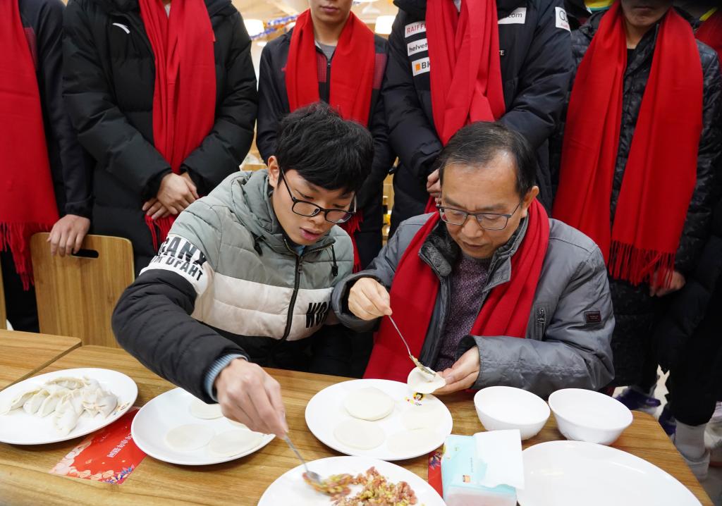 校领导与留校学生一起包饺子。