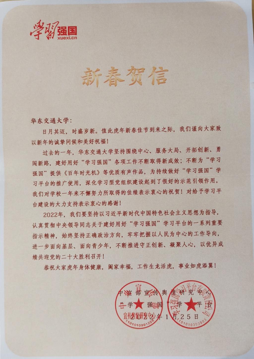 日前,中宣部宣传舆情研究中心、“学习强国”学习平台发来新春贺信,向大家致以新年的诚挚问候和美好祝福。