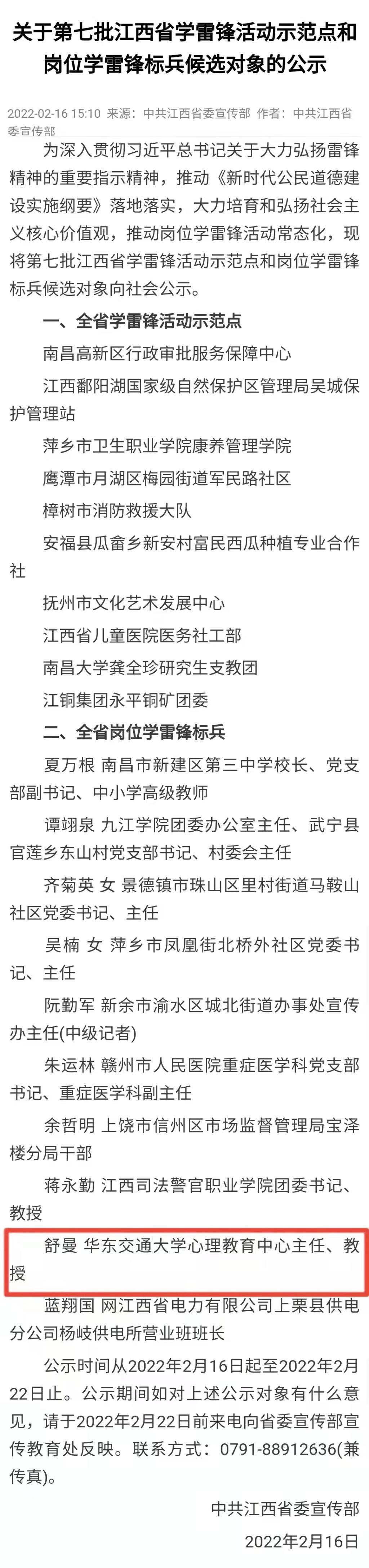 近日,第七批江西省学雷锋活动示范点和岗位学雷锋标兵名单公布,beat365心理教育中心(心理素质教育研究院)舒曼教授入选“岗位学雷锋标兵”。