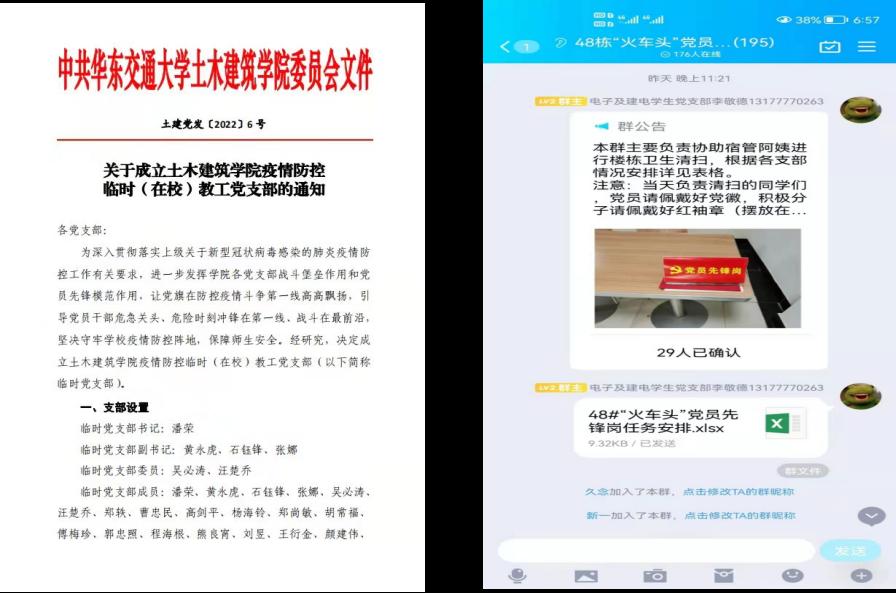 校党委组织部迅速下发《致全校各级党组织和全体党员的倡议书》《关于在维护宿舍楼栋卫生中充分发挥党员先锋模范作用的通知》等文件,发动基层党组织和师生党员带头争做铁人铁军,共筑疫情防控的铜墙铁壁,坚决守牢学校疫情防控“主阵地”。