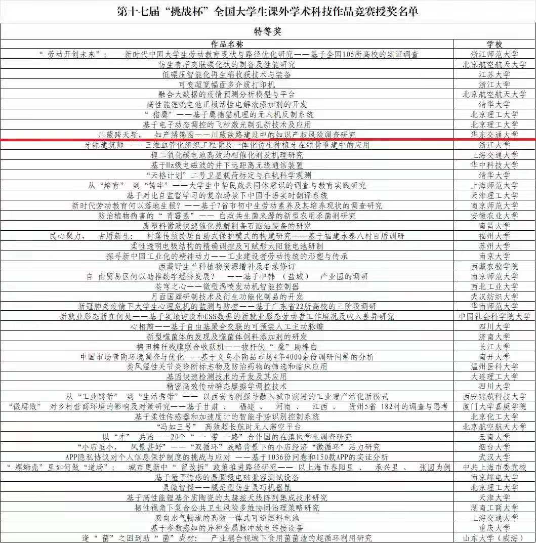近日,第十七届“挑战杯”全国大学生课外学术科技作品竞赛授奖名单公布,beat365作品位列第9,荣获全国特等奖(全国仅49项),学校位列获特等奖地方院校第3,创下华交历史最好成绩,实现特等奖零的突破。