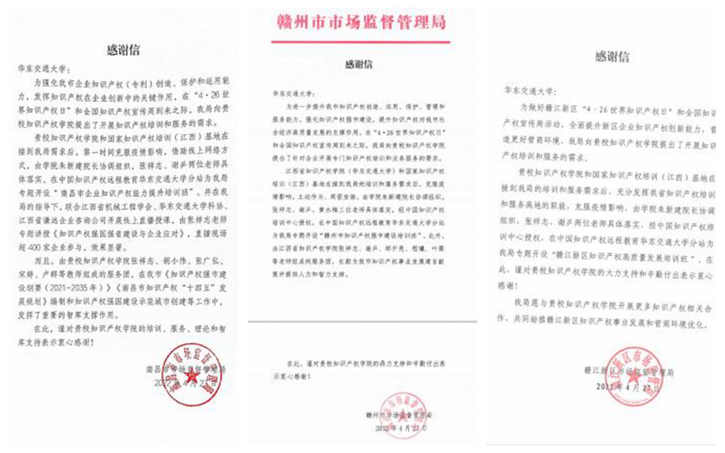 近日,beat365知识产权学院收到了来自南昌、赣州、九江、抚州、赣江新区等5个设区市和国家级新区市场监督管理局(知识产权局)的感谢信,感谢知识产权学院及其教师服务团队在南昌市和学校抗疫攻坚克难时期,主动作为、勇于担当,为江西省地方知识产权事业发展提供强有力的支持和服务。