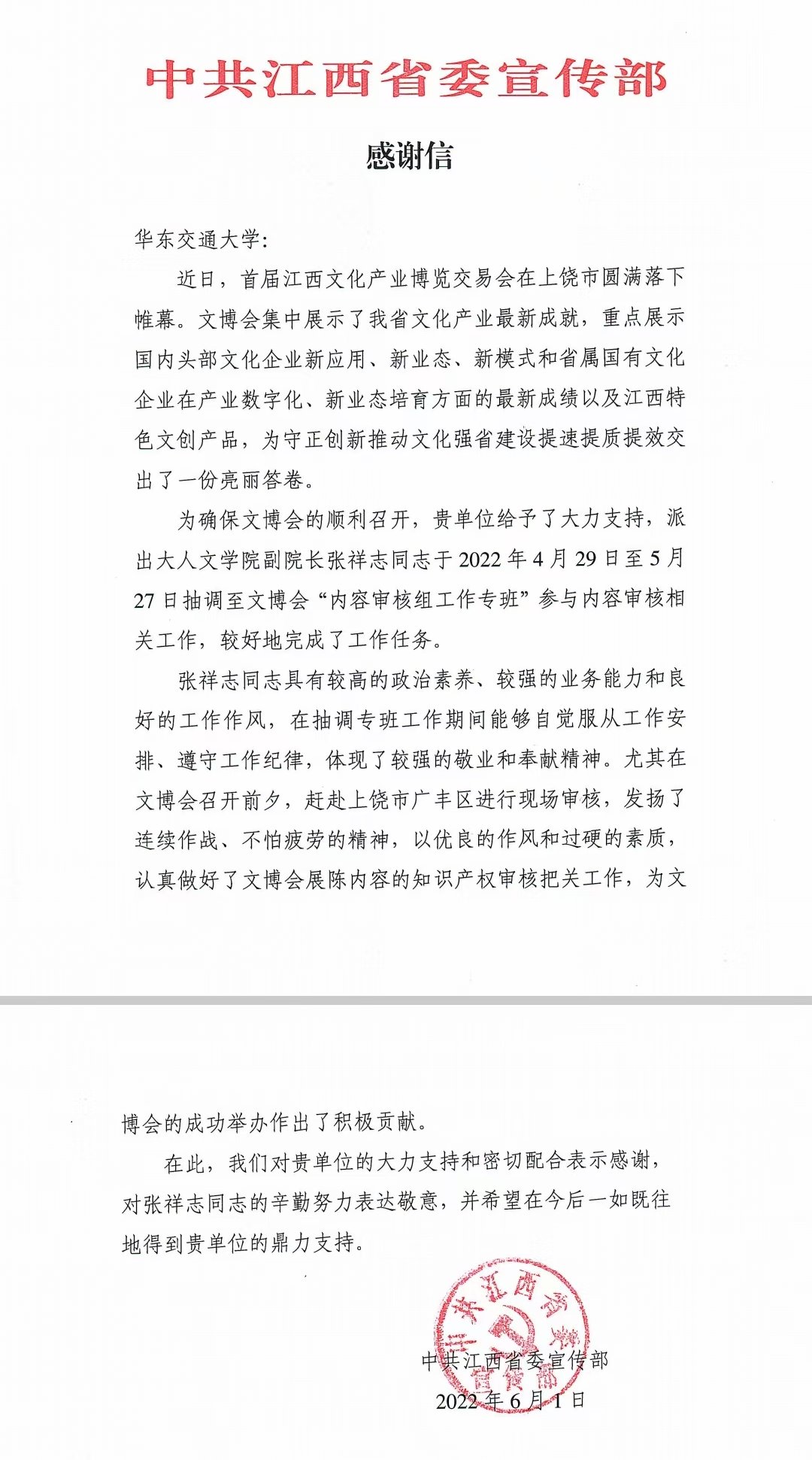 省委宣传部发感谢信感谢张祥志参与全江西文化产业交易博览会版权审核工作。