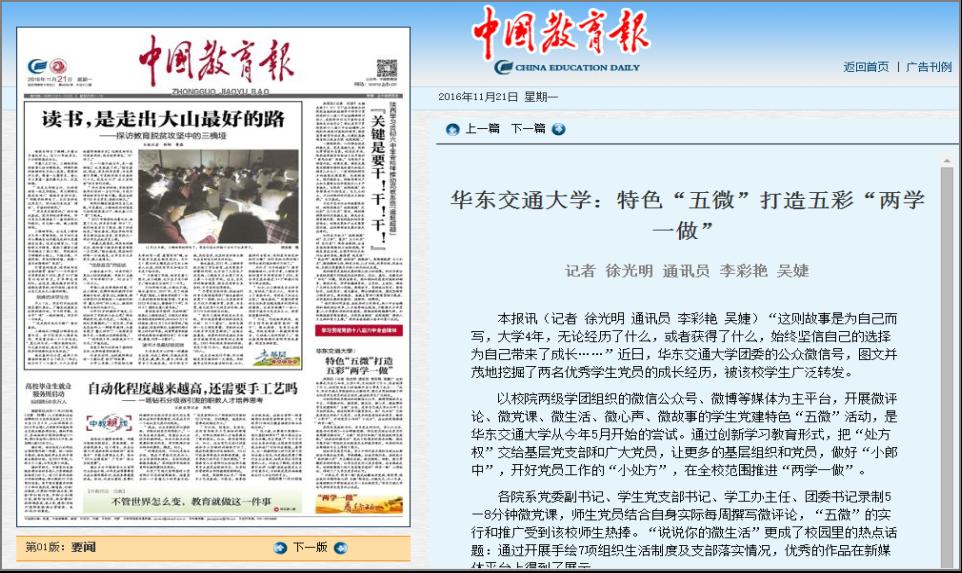 《中国教育报》头版报道学校以“五微”为载体,深入推进学生党员“两学一做”学习教育的主要做法和成效。