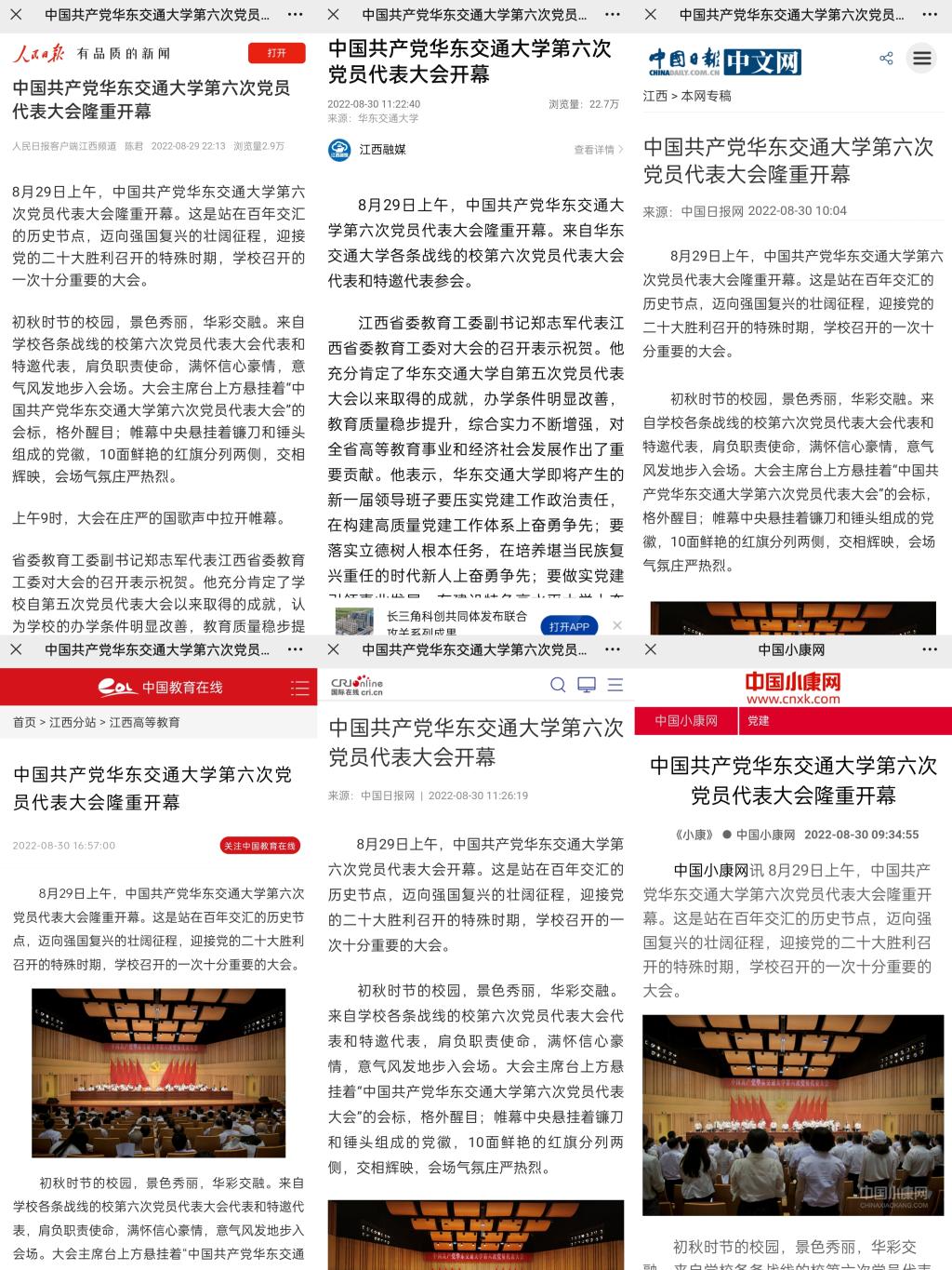 编者按:8月29日上午,中国共产党beat365中文唯一官网第六次党员代表大会隆重开幕。这是站在百年交汇的历史节点,迈向强国复兴的壮阔征程,迎接党的二十大胜利召开的特殊时期,学校召开的一次十分重要的大会。人民日报客户端、新华社客户端、人民网、中国日报网、中国教育在线、央广国际在线、中国小康网、江西新闻客户端、江西文明网等多家媒体纷纷报道。