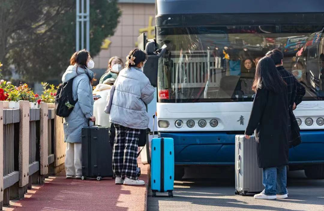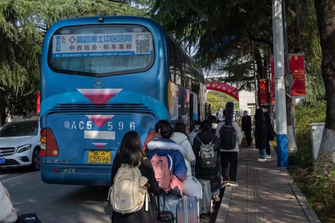 据悉,12月13日至14日,返乡学生可在“华交学工”微信公众号上提前预约,乘坐学校班车至南昌西站、南昌火车站和昌北机场。学校还专门为学生们准备了防疫大礼包,包括口罩、消毒湿巾等防疫物资,让同学们把“温暖”带回家。(摄/马莉娅、沈展锐、陈新锐)