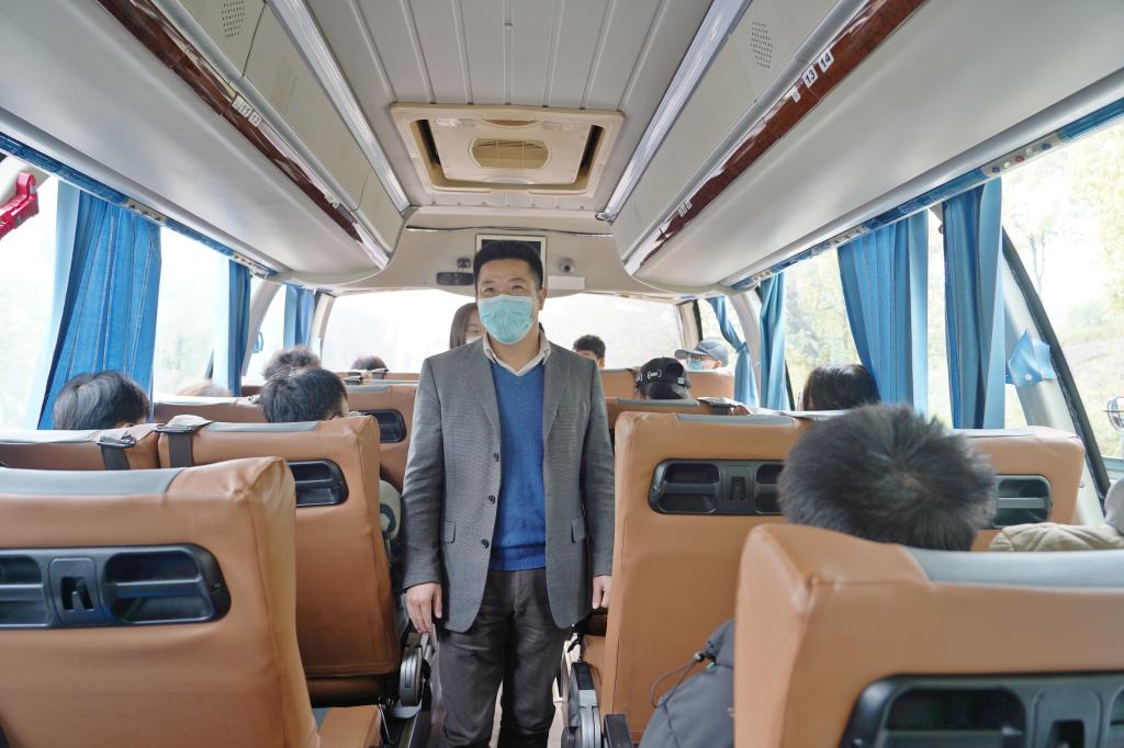 在南区乘车点,柳和生登上接送大巴,叮嘱大家路上要注意自身安全,戴好口罩,做好防护,到家后及时向辅导员报告。他期待大家开学健健康康地回来,并祝福大家一路平安。