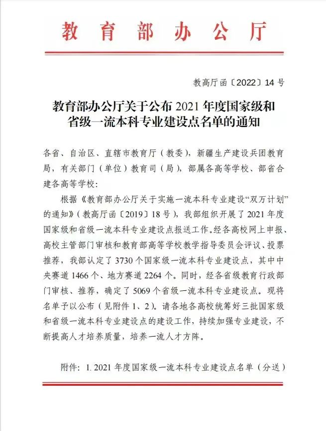 6月8日,教育部办公厅公布了2021年度国家级和省级一流本科专业建设点名单。学校5个专业入选国家级一流本科专业建设点,5个专业入选省级一流本科专业建设点。截至目前,学校共有43个一流本科专业建设点,入选数在省内高校排名第三,其中24个国家级一流本科专业,19个省级一流本科专业。一流专业建设点数占招生专业数86%,在省内高校地方赛道排名第一。