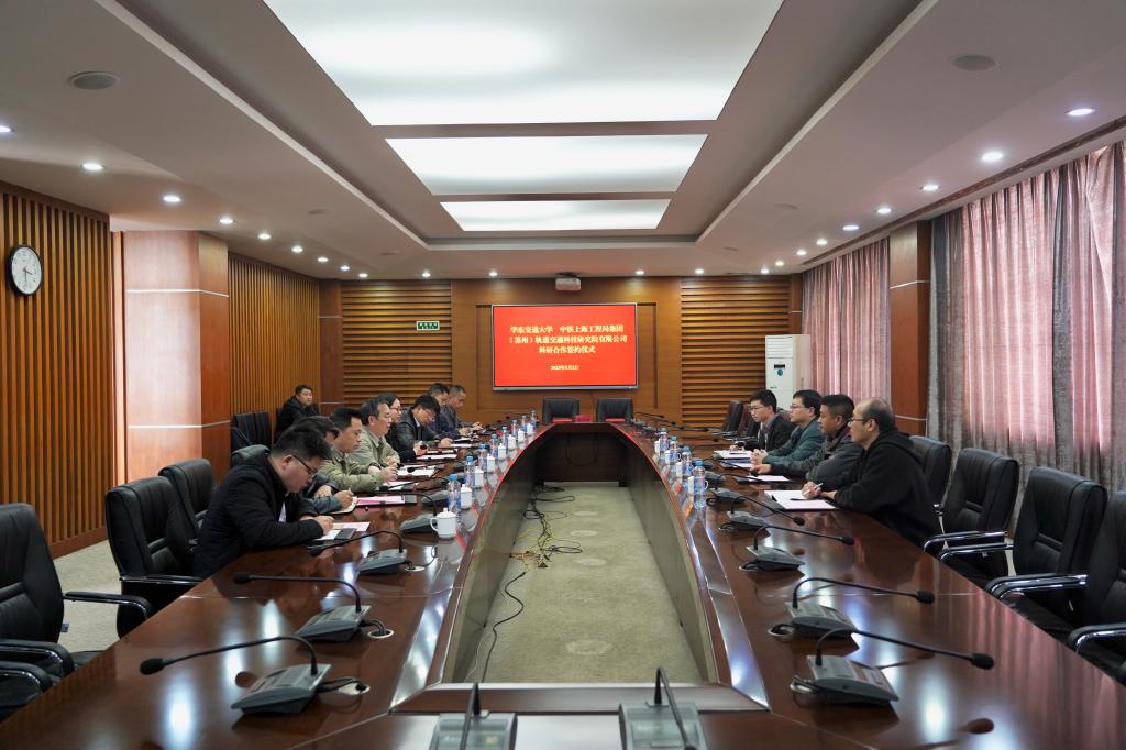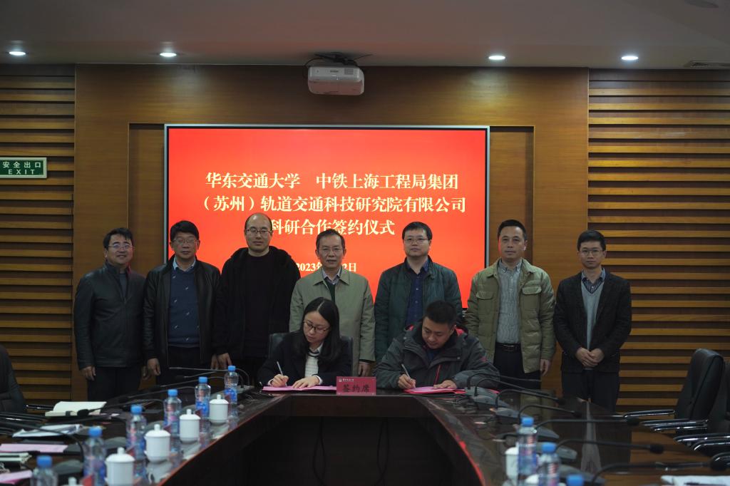 校党委委员、副校长罗文俊与中铁上海工程局集团(苏州)轨道交通科技研究院有限公司华海公司轨道研发中心主任兼苏州轨道研究院经理范宝明代表双方签署《科研合作框架协议》。