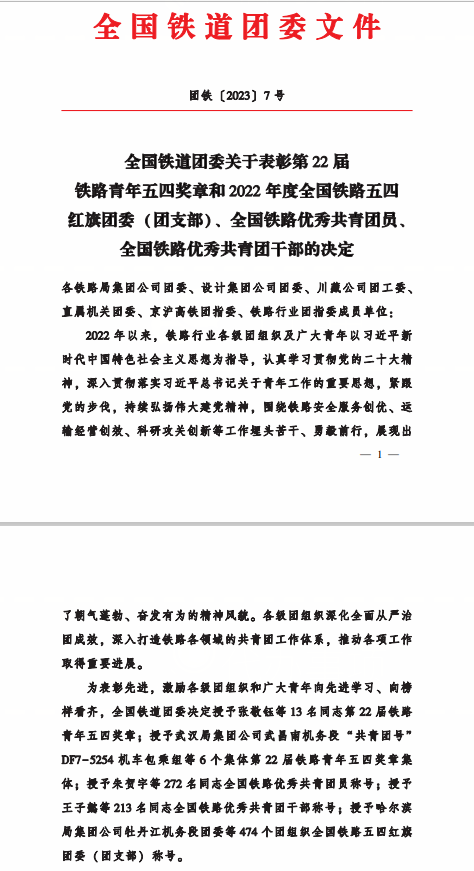 铁路青年五四奖章集体是全国铁道团委授予铁路青年和集体的最高荣誉。此次评选,旨在表彰铁路行业各级团组织及广大青年围绕铁路安全服务创优、运经营创效、 科研攻关创新等工作埋头苦干、勇毅前行,展现出的朝气蓬勃、奋发有为的精神风貌。