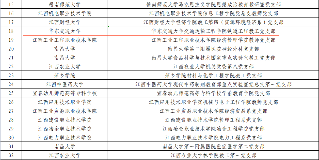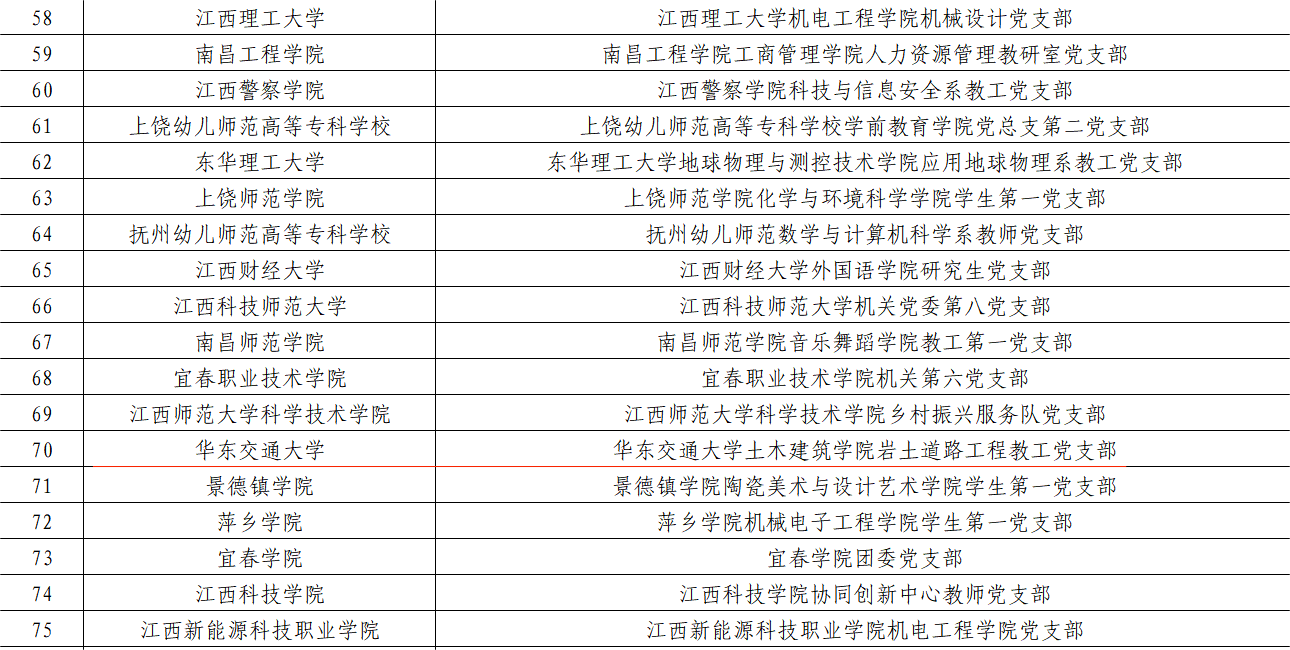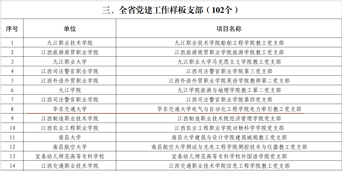 近日,省委组织部、省委教育工委公布了首批全省党建工作示范高校、标杆院系、样板支部及“‘双带头人’教师党支部书记工作室”培育创建单位名单,beat365党委入选首批全省党建工作示范高校培育创建单位;交通运输工程学院党委、机电与车辆工程学院党委入选全省党建工作标杆院系培育创建单位;电气与自动化工程学院党委电力牵引教工党支部、交通运输工程学院党委铁道工程教工党支部、土木建筑学院党委岩土道路工程教工党支部入选全省党建工作样板支部培育创建单位;经济管理学院党委经济系党支部书记工作室入选全省高校“双带头人”教师党支部书记工作室培育创建单位,实现申报单位入选“全满贯”,入选数量居省内高校前列。