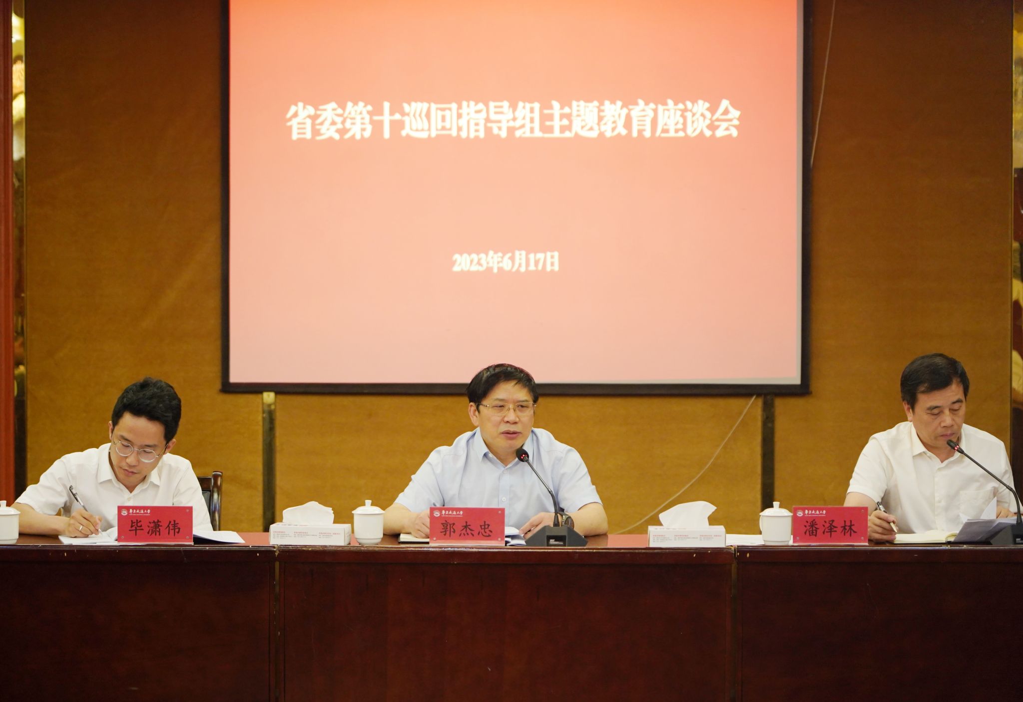 6月17日,省委第十巡回指导组在beat365中文唯一官网召开主题教育座谈会。指导组组长郭杰忠出席会议并讲话,省委主题教育领导小组办公室联络组代表毕潇伟,省委第十巡回指导组全体组员,10所学校分管领导、主题办负责同志参加会议。指导组副组长潘泽林主持会议。