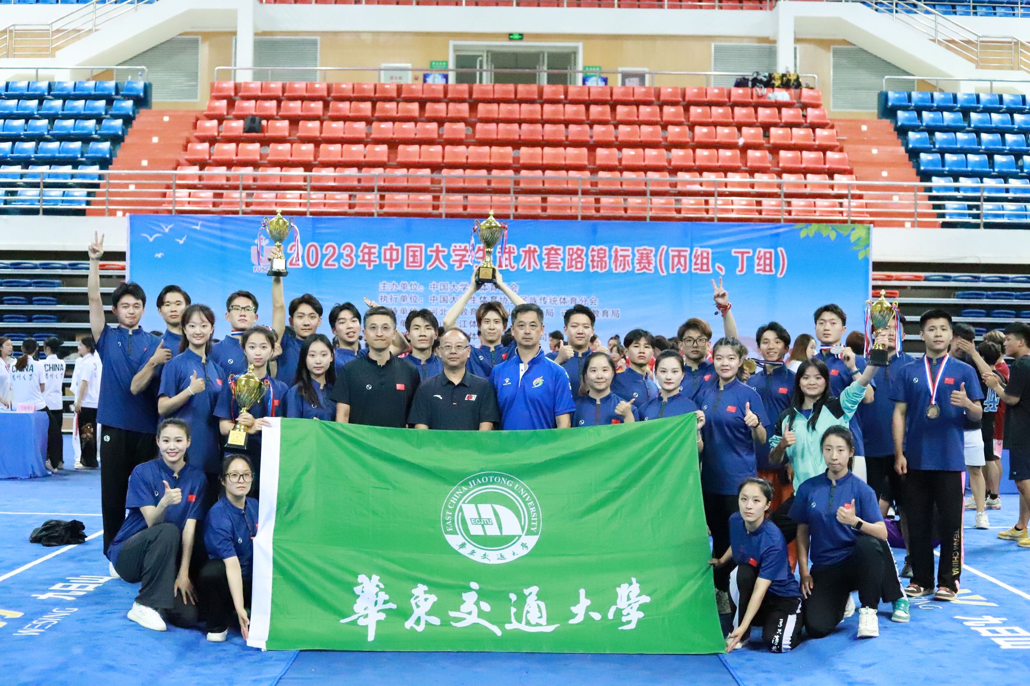 据悉,“火车头”武术队共选派24名运动员参赛,与来自复旦大学、浙江大学、天津理工大学、华中科技大学、兰州大学、北京体育大学、上海体育大学、天津体育学院等55支代表队、550余名“武林高手”同台竞技。比赛中,“火车头”武术队不畏强劲对手,沉着应战,不负众望、不辱使命,以一队之光为学校添彩,再一次在全国赛场上擦亮了华交“金色名片”。