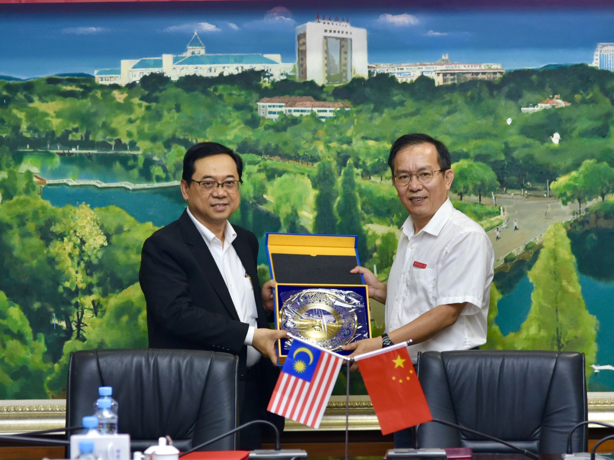 柳和生、Datuk代表双方学校互赠纪念品,罗文俊、Mohd代表双方签署校际合作协议。