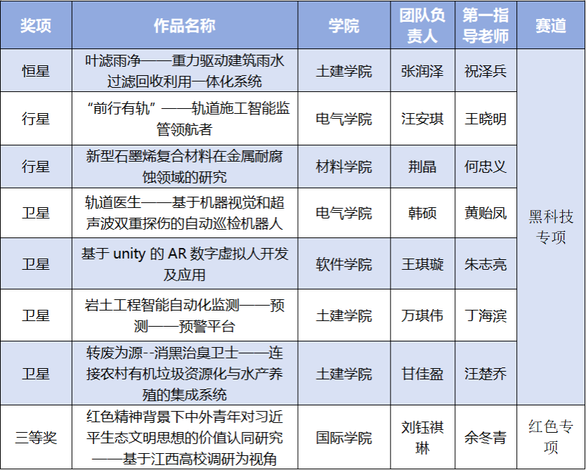 在主赛道中,beat365参赛作品获二等奖2项、三等奖4项。在专项赛中,beat365参赛作品获“黑科技”专项赛“恒星级”(一等奖)1项、“行星级”(二等奖)2项、“卫星级”(三等奖)4项;红色专项赛三等奖1项。