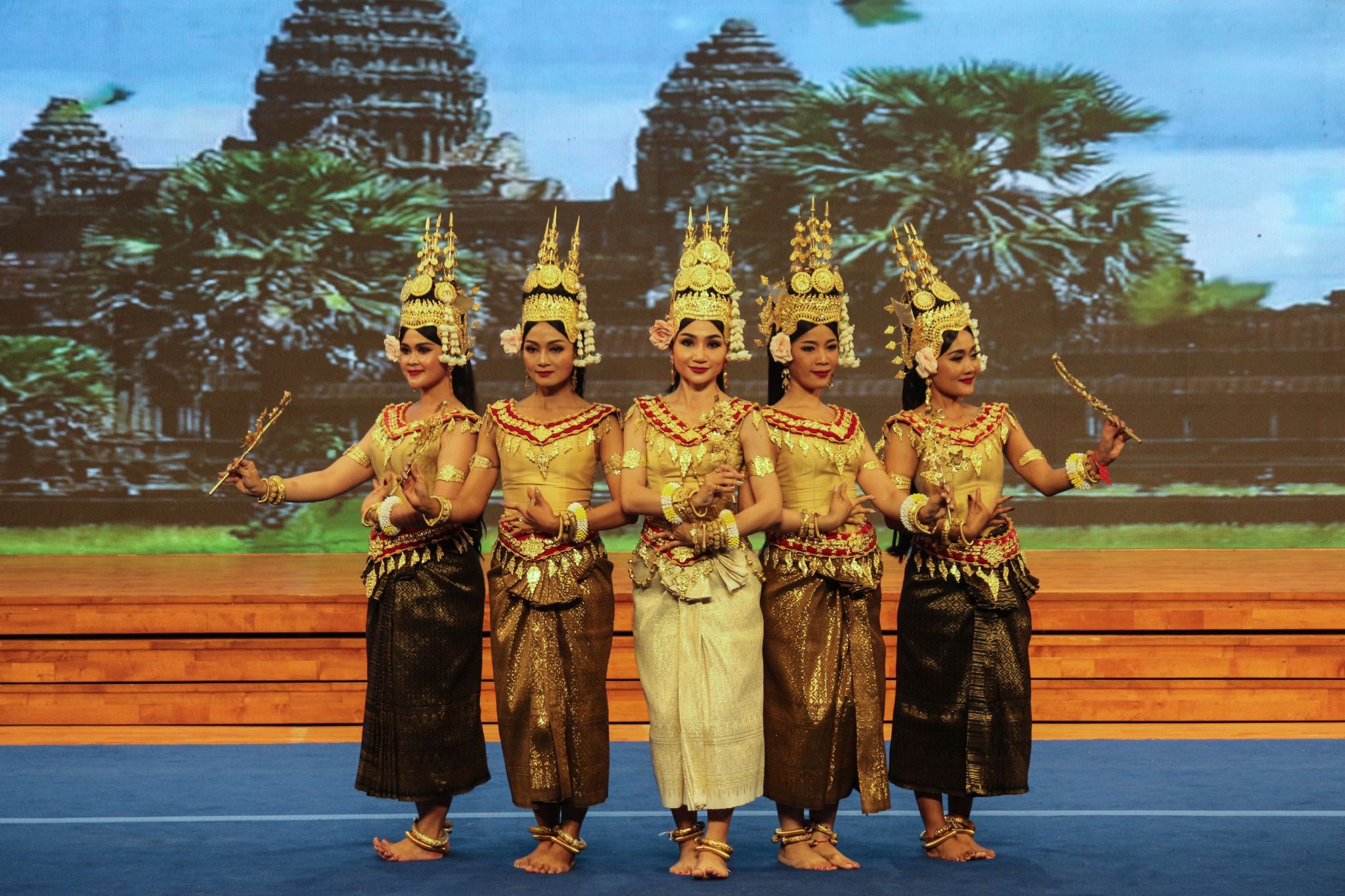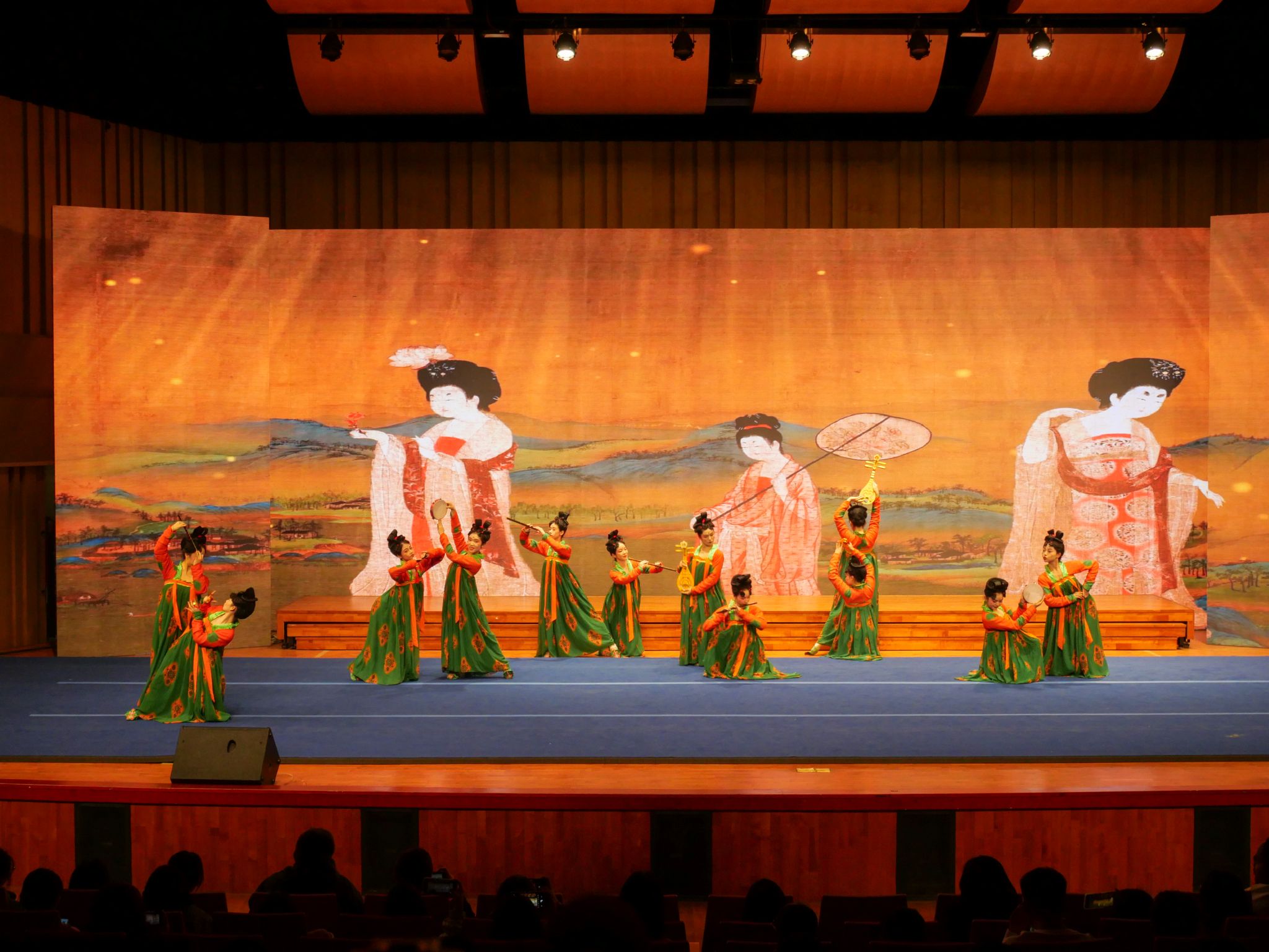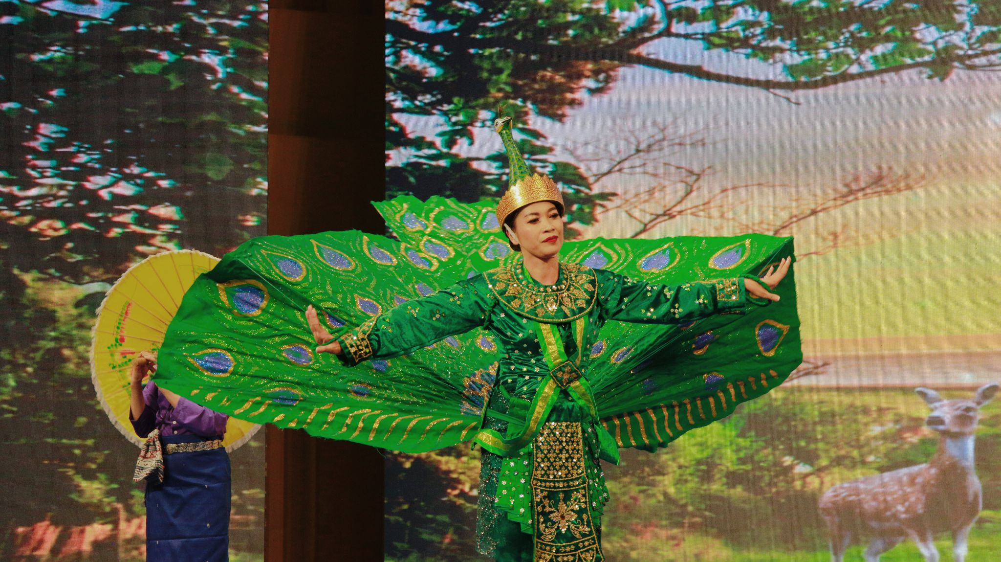 柬埔寨舞蹈《飞天》,舞者们身着柬埔寨传统服饰,用美丽而优雅的舞姿展现民族特色;被列入联合国教科文组织《人类非物质文化遗产代表作名录》的舞蹈《哈努曼戏美人鱼》,通过灵活多变的肢体语言,以舞传意,让观众了解到其孔剧的精髓;《拜林孔雀舞》,在柬埔寨民族乐的伴奏下,舞者以优美的身姿,使得两只“绿孔雀”栩栩如生、活灵活现。