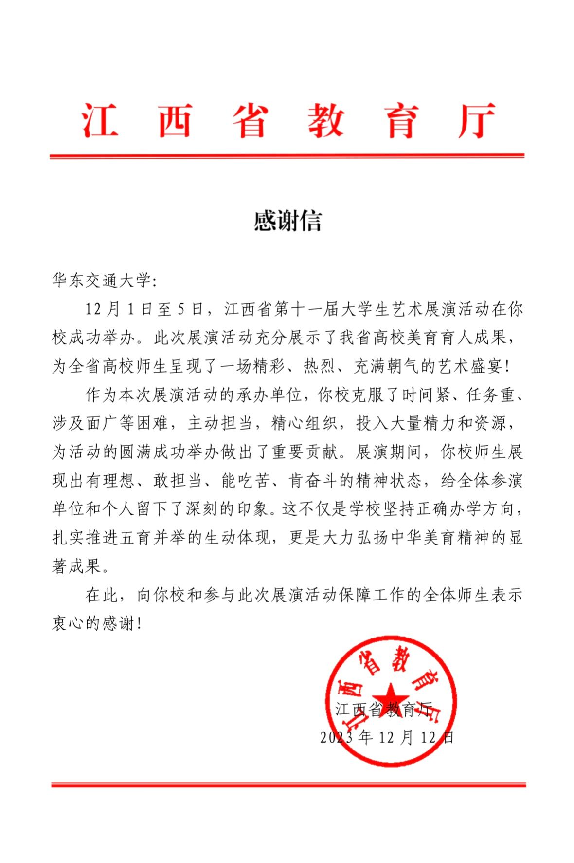 近日,江西省教育厅向beat365发来感谢信,对beat365承办江西省第十一届大学生艺术展演活动和参与此次展演活动保障工作的全体师生表示衷心感谢。
