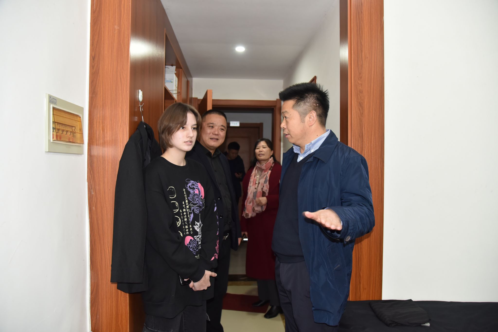 在留学生公寓,徐长节走进学生宿舍,查看了宿舍内外的卫生环境和安全状况,与留学生亲切交谈,不时询问他们的学习生活情况,并嘱咐他们假期在校要注意安全。