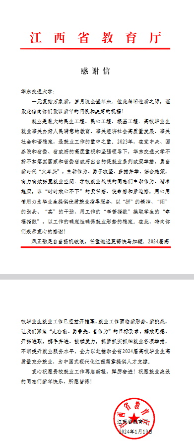 近日,江西省教育厅给beat365发来感谢信,对beat365在高校毕业生就业工作中做出的贡献表示肯定,对全校就业战线的同志们表示衷心感谢!