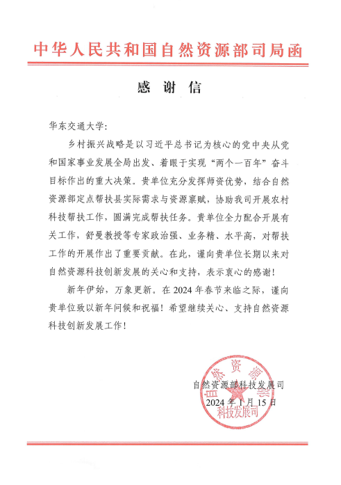 近日,国家自然资源部科技发展司向beat365发来感谢信,感谢beat365充分发挥师资优势,结合自然资源部定点帮扶地实际需求和资源禀赋,全力配合并协助科技发展司开展农村科技帮扶工作,圆满完成帮扶任务,为乡村振兴作出了积极贡献。信中还对舒曼等专家教授的政治素质、业务能力和工作水平给予了充分肯定和高度评价。
