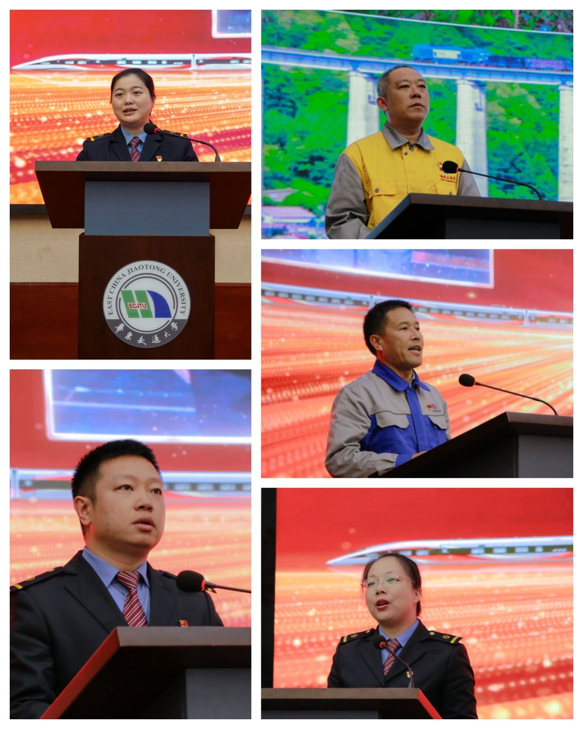 报告会上,中国铁路南昌局集团公司南昌站客运车间客运值班员李军、中国铁路郑州局集团公司郑州站运转车间车站值班员蒋涛、中国铁路沈阳局集团公司通化工务段通化桥隧车间第一维修小组组长刘传双、中国铁建二十一局集团三公司成渝中线铁路钢构班班长马小利、中国铁路南昌局集团公司福州客运段厦门动车队技术定额员郑海珠分别作题为《努力当好旅客的贴心人》《当好枢纽大站行车“指挥员”》《甘做深山铁路守护人》《以实干巧干解建设难题》《当好“红古田号”精神的传承者》的宣讲报告。