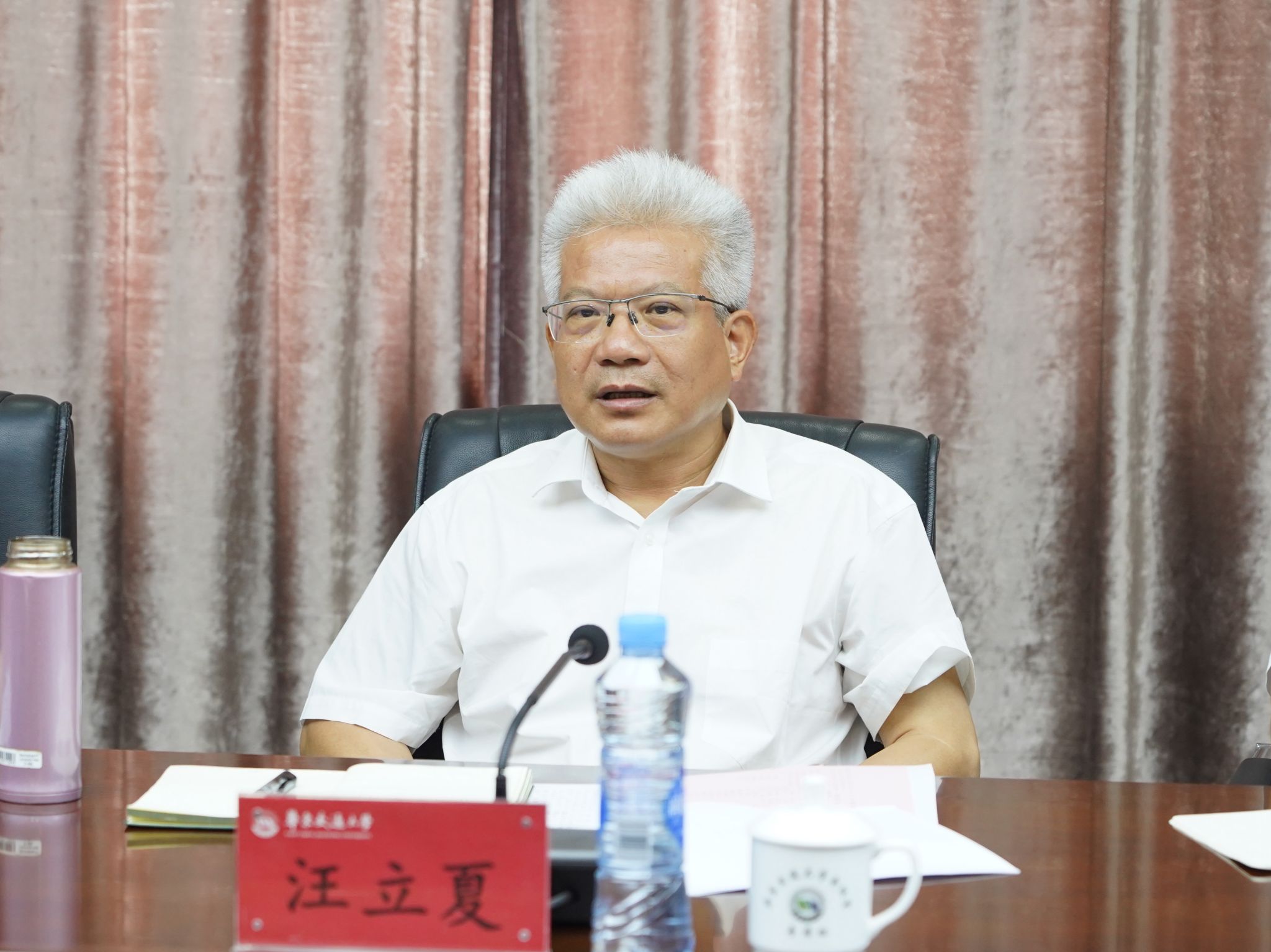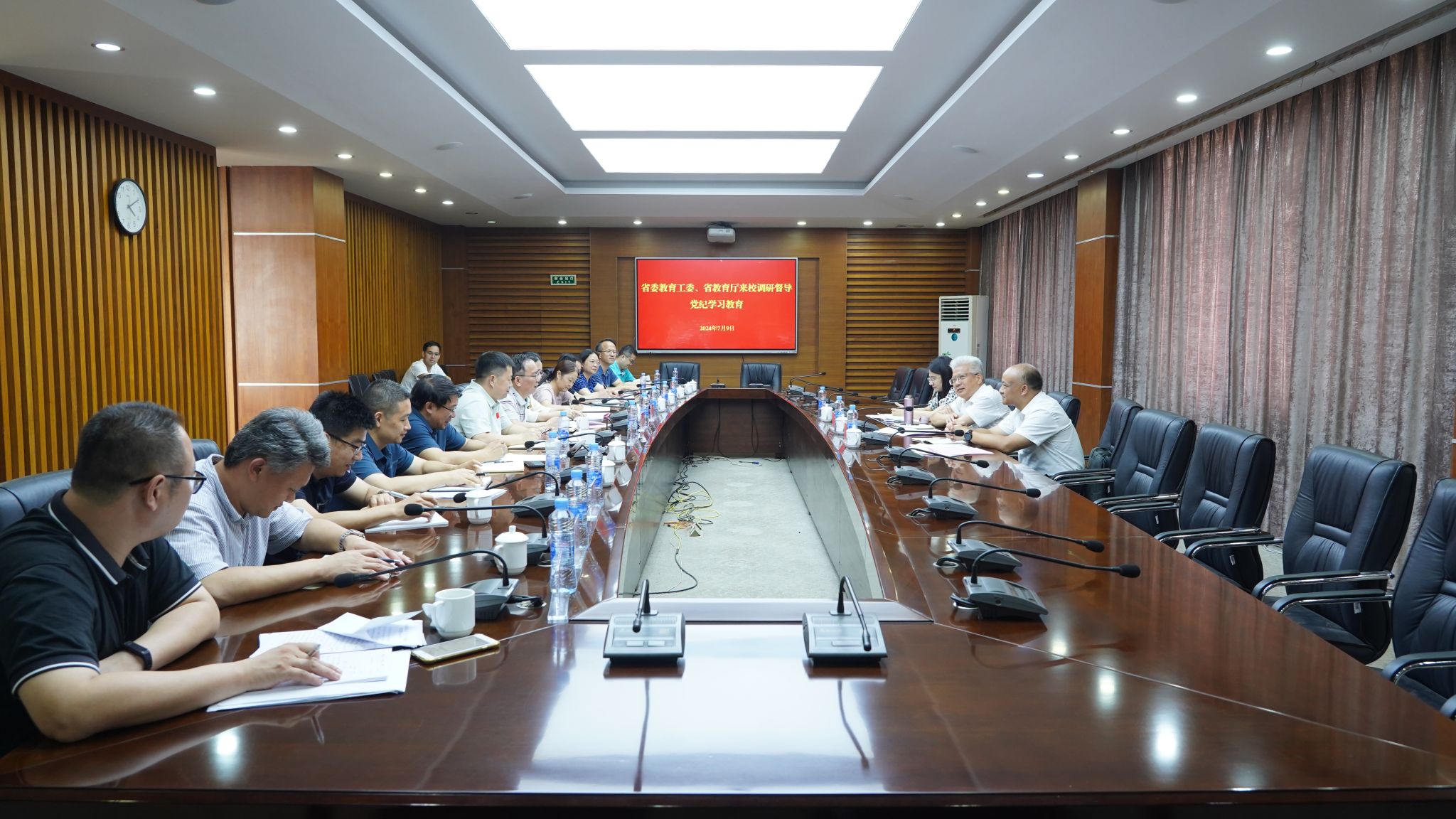 7月9日下午,省委教育工委委员、省教育厅副厅长汪立夏一行3人来校调研督导党纪学习教育。校党委书记柳和生、党委副书记罗文俊出席会议。