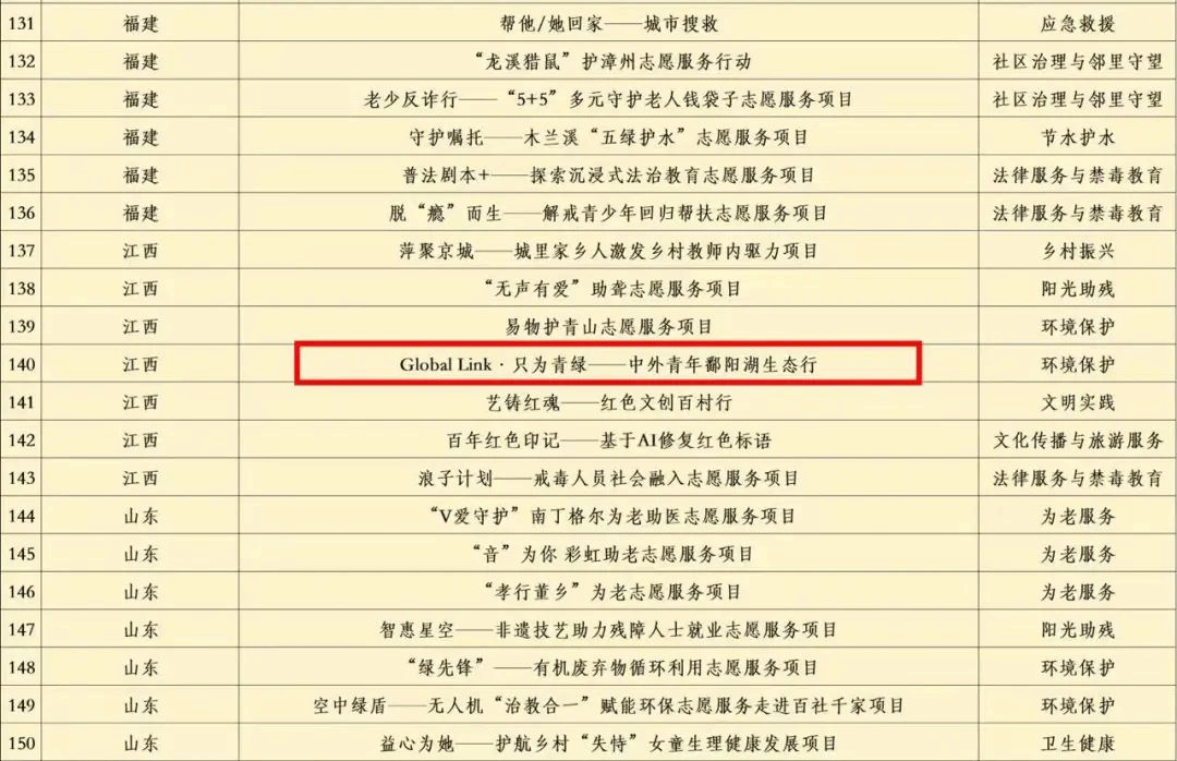 11月30日至12月1日,第七届中国青年志愿服务项目大赛全国赛终评在广东汕头举行。beat365国际学院选送的“Global Link 只为青绿——中外青年鄱阳湖生态行”项目斩获银奖,实现了学校在该赛事中国家级奖项零的突破。此前,beat365在省赛环节以1金1银2铜创历史最好成绩,获奖数并列全省第一。