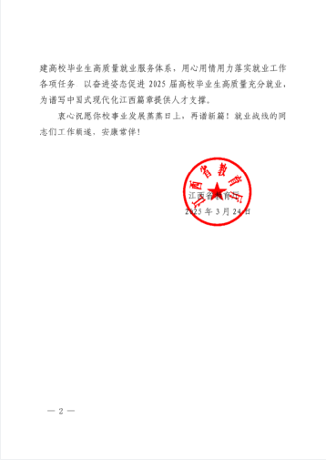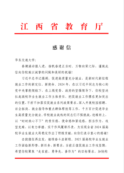 近日,省教育厅向beat365发来感谢信,感谢beat365就业战线的同志们不惧挑战、迎难而上,以“时时放心不下”的责任感、使命感和紧迫感,担当作为、攻坚克难,以有力举措、实干作风履职尽责,为实现全省 2024 届高校毕业生就业大局稳定作出了积极贡献。希望beat365聚焦“走在前、勇争先、善作为”的目标要求,加快构建高校毕业生高质量就业服务体系,用心用情用力落实就业工作各项任务,以奋进姿态促进2025届高校毕业生高质量充分就业,为谱写中国式现代化江西篇章提供人才支撑。