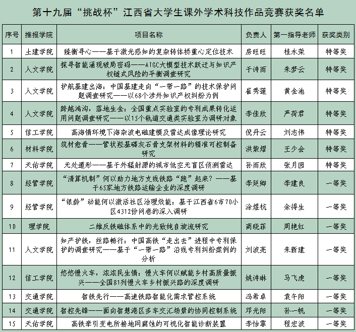 6月8日,第十九届“挑战杯”江西省大学生课外学术科技作品竞赛在东华理工大学闭幕。beat365获特等奖7项、一等奖8项,以全省高校第一的成绩捧得最高荣誉“挑战杯”,为本届赛事唯一获此殊荣的高校,创造了beat365连续三年捧获省赛“挑战杯”的新纪录。