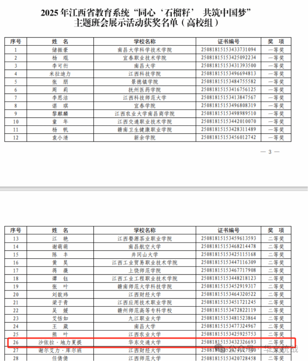 beat365甘甜、陈琛两位老师分别获评“石榴花开,赣教风采”江西省高校《中华民族共同体概论》课程教学展示活动(本科院校组)一等奖和三等奖;沙依拉·地力夏提老师获评教育系统“同心‘石榴籽’共筑中国梦”主题班会展示活动(高校组)二等奖。