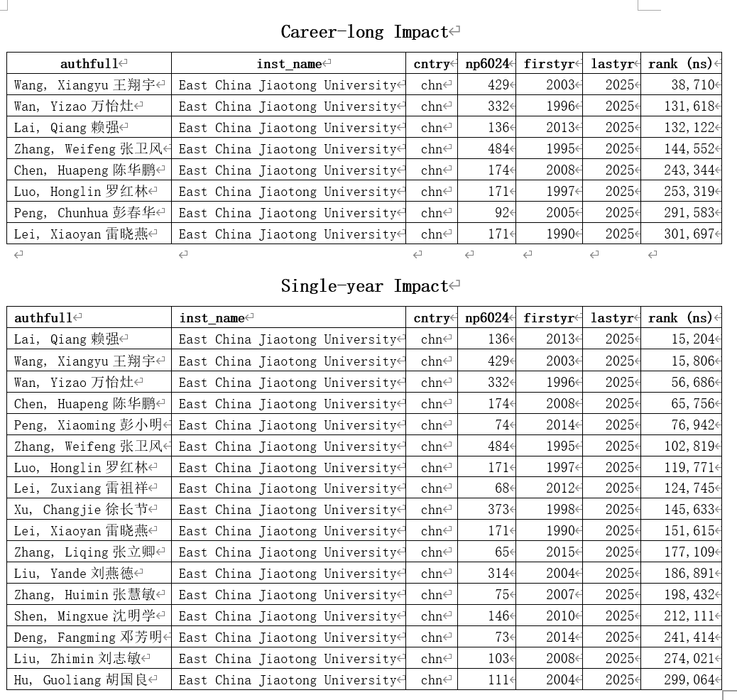据了解,全球前2%顶尖科学家榜单分为“终身科学影响力排行榜” (统计科学家职业生涯期间的综合表现)和“年度科学影响力排行榜” (聚焦上一年度的学术影响力)两大部分,从全球近700万名科学家中,通过基于其论文引用数、h因子、合著者修正的hm因子、单独或第一作者的文章引用数等综合参数,遴选出世界排名前2%的科学家,涵盖22个领域和174个子领域,为科学家长期科研表现提供了一个衡量指标,能够更客观、更真实地反映科学家的影响力。