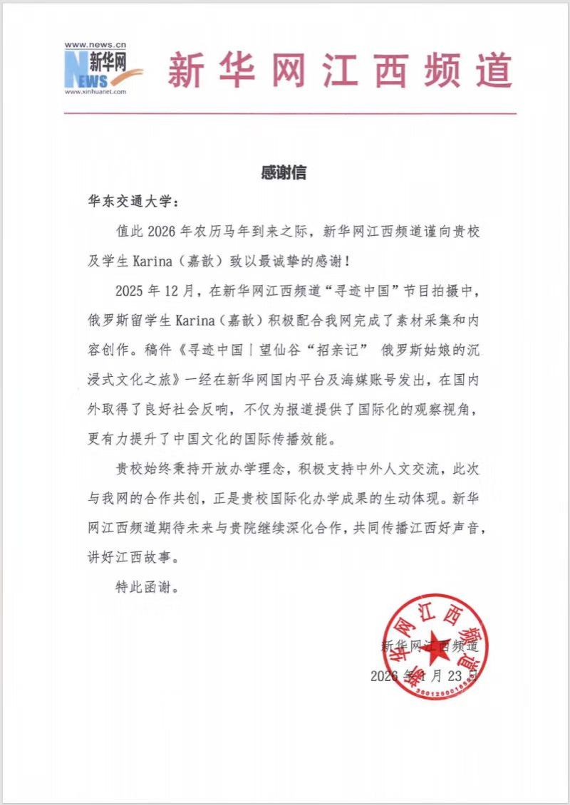 近日,beat365收到新华网江西频道发来的感谢信,信中对beat365俄罗斯留学生Karina(嘉歆)在“寻迹中国”节目拍摄过程中的积极参与和出色表现给予高度评价,并对beat365在国际文化交流与传播方面的持续努力与扎实成效表示充分肯定。