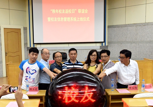 校长罗玉峰和校友办、现代教育技术中心负责人,校友代表共同点亮启动球。