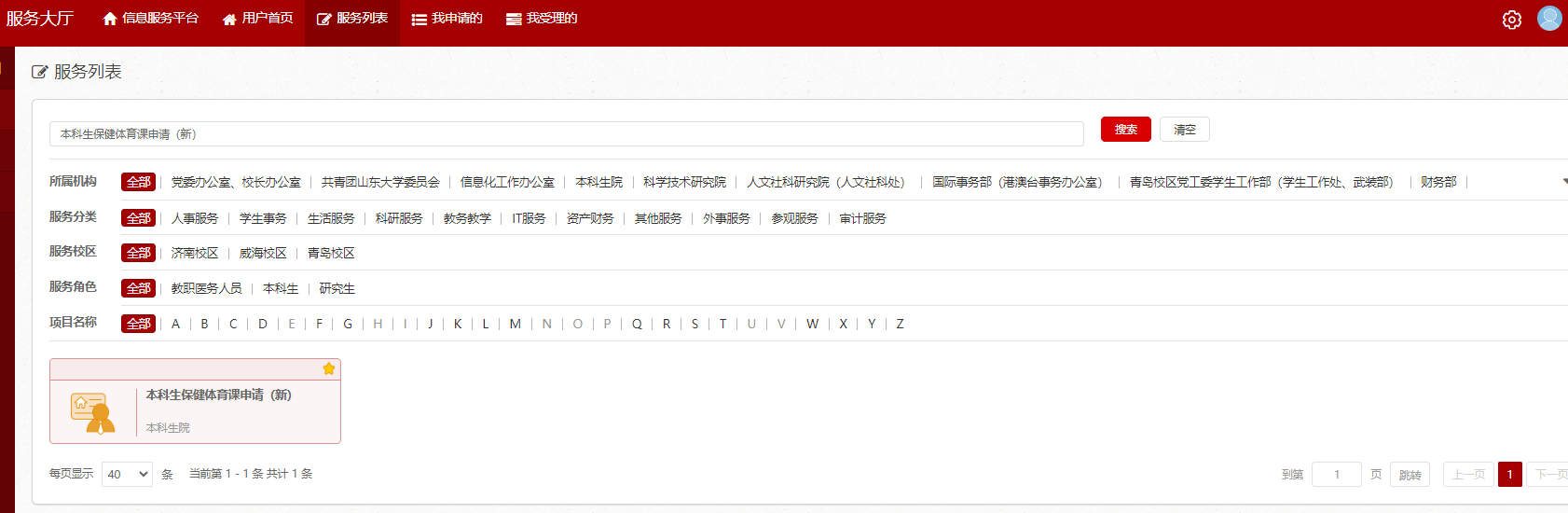 登录服务大厅,搜索“本科生体育保健课申请(新)”。按照要求填写相关信息,提交《beat365中文官方网站本科生体育保健课校医院审批表》以及三级甲等医院诊断证明,二者缺一不可。审批表校医院审批盖章后,通过服务大厅上传,由beat365中文官方网站审批。