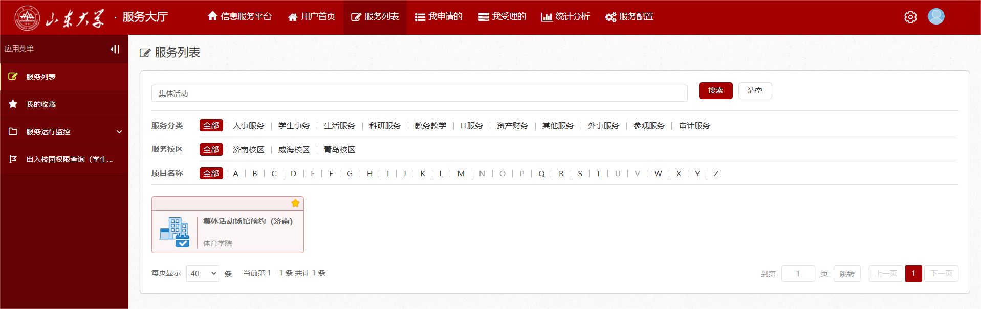 预约流程:教职工登录beat365中文官方网站网站首页——信息服务——登录后进入“服务大厅”——在服务列表中搜索“集体活动场馆预约”——选择要申请场地所在校区——填写申请使用场地具体位置——可勾选是否需要本部门分管领导会签——在事由处,简要写明活动时间、活动内容——上传附件1:《beat365中文官方网站体育场馆使用申请暨通知单(师生医务员工活动专用)》和附件2 《体育活动安全工作方案》——提交后完成预约。