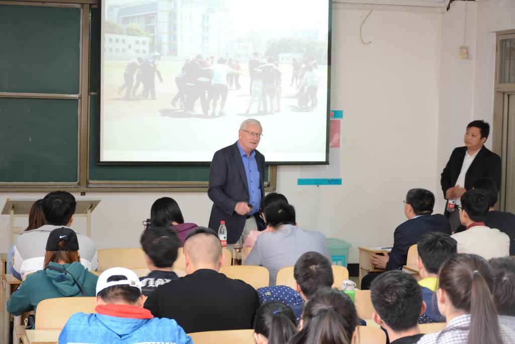 讲座开始之前,石振国代表学院致欢迎辞,他热烈欢迎丹麦葛莱beat365中文官方网站代表团的到来。紧接着,Finn Berggren教授开始了他幽默风趣却又精彩纷呈的演讲。首先,他介绍了葛莱体院的地理位置、发展历史等学校简介。值得一提的是,在丹麦很多学校并没有规模庞大的专项场馆,他们更多注重空间及设施的充分利用,室内场馆可供足球、篮球、排球、羽毛球等多项运动使用,这一点很值得中国的学校学习借鉴。他还明确指出,葛莱体院教学的目标为是让学生回到家乡以后能够继续教育和分享与体育、健康、生活质量有关的理念,葛莱体院也因此成为丹麦第一个宣传社会和谐的地方。其次,他提出葛莱体院的主要工作便是教会学生如何享受体育带来的快乐,并使其伴随一生。他还介绍了葛莱体院在课程设置方面的两大特色,其一是在他们的学校里是没有考试的,在每一个星期,他们都会和每一个老师讨论每一个学生的表现,并积极跟进每个学生的学习生活状态;第二个特点则是他们提倡把古老的,传统的游戏融入到现代的教学中去,将体育游戏化。作为欧洲最早开设跑酷课程的学校,葛莱体院最为出名的便是跑酷课了,葛莱体院有着浓厚的跑酷氛围,有自己的跑酷公园供学生练习,很多学生更是十分热爱这项运动,课上课下、有无场地都在练习。最后,他向在座的各位提出了一个问题,即体育最基础的要素是什么?他的回答是Fun,即学校应该做到让学生快乐地去学,主动地去学,而不是被动的去学那些枯燥无味的东西。同时,他对同学们发出诚挚的邀请,邀请同学们共赴葛莱体院,共同学习交流。讲座最后,石振国代表学院全体师生向丹麦葛莱beat365中文官方网站代表团致以真诚的感谢。
