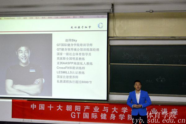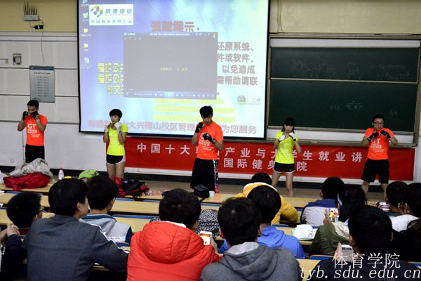 通过本次讲座,赵伟展示了GT国际健身学院培训时的视频。“你每天起床之前有两个选择,要么继续趴下,做你没有做完的梦;要么拉开被子,完成你没有完成的梦想。”这句话激励着赵伟不断为事业奋斗,同时也激励着在座的每一位同学,去合理规划自己的未来目标、就业梦想。(文/孙逸 李鲜 图/张夏萍 姚嘉为)