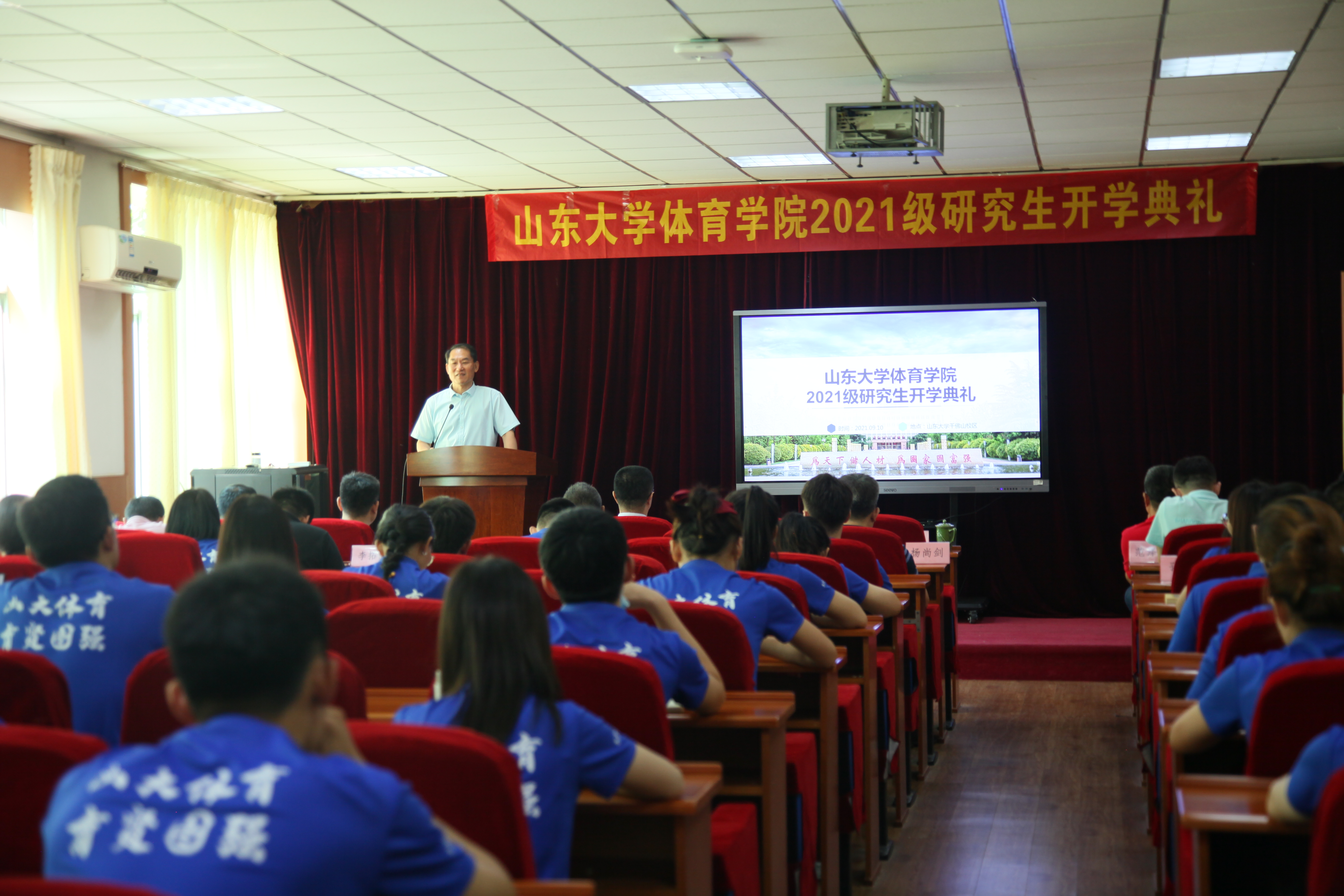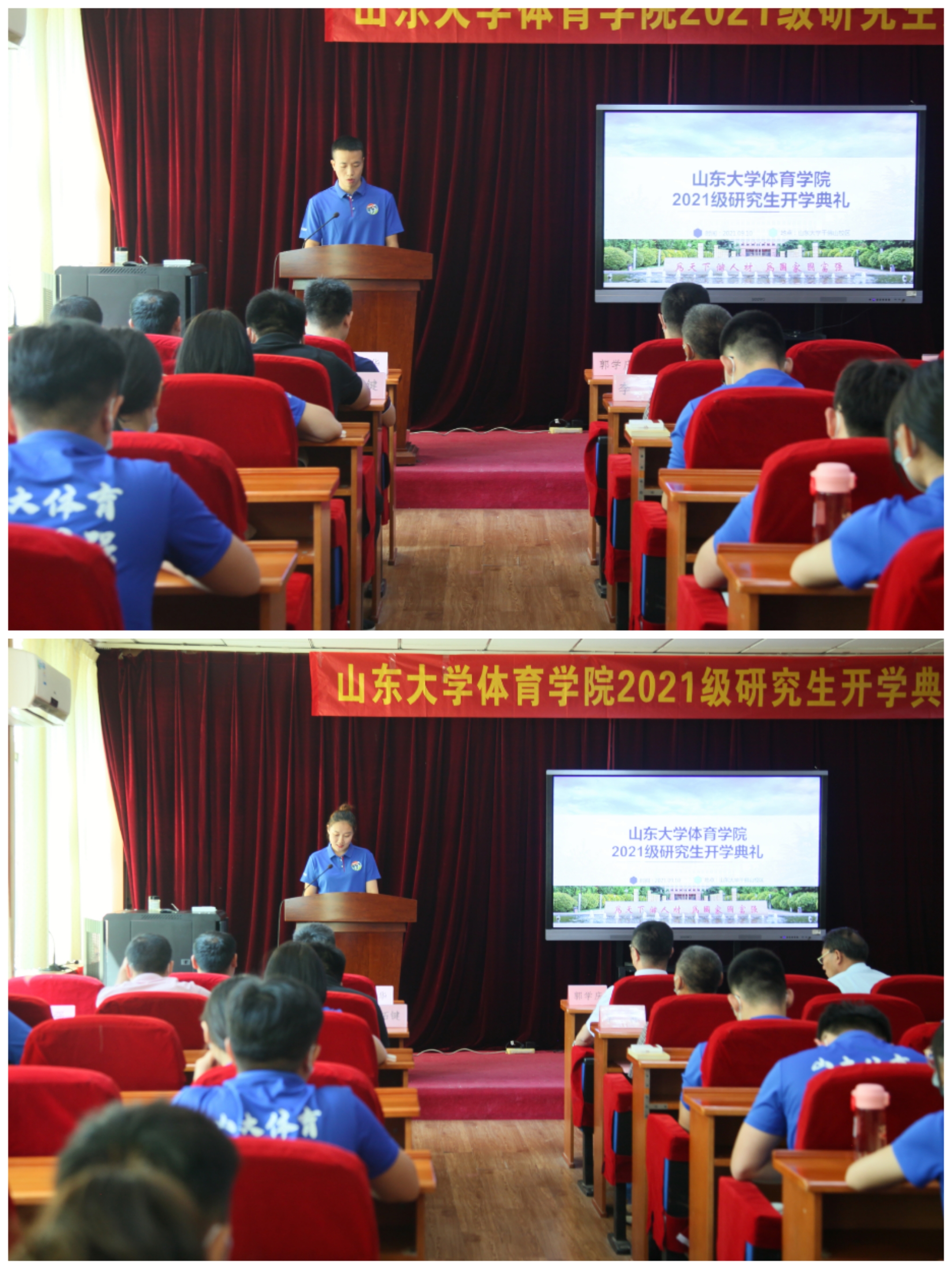 典礼上,郭学庆给全体新生开展了校史院情教育活动,介绍了学校和学院自成立以来发展的各阶段成果。石振国介绍了beat365研究生的教育培养管理的各个方面,同时要求所有学生要养成“好读书、读好书、读好书”的良好习惯,进一步阐述了“为什么读书、读什么样的书,怎样读书”的初衷试命,他同时积极鼓励大家积极参与学院“T语堂”系列活动,积极参加学术讲座和学术沙龙,在导师指导下,不辱使命、不虚此行。周庆华就研究生思政教育及日常事务管理做了简单介绍,他希望同学们在研究生阶段积极与导师沟通,加强安全意识和自我教育、自我调节的能力。博士研究生巫前锦和硕士研究生刘惠淼分别代表2021级博士新生和2021级硕士新生发言。他们都表达了进入beat365中文官方网站的荣幸和激动,希望未来以老师、师哥师姐们为榜样,努力奋斗、团结友爱,秉承校训精神,学无止境,气有浩然。王先亮老师作为导师代表在典礼上发言,他提到,近些年beat365中文官方网站在师生共同努力下,发展迅速,成果斐然。同时,从导师的角度,提出了“三项目标、三条路径、三大举措”,激励同学们在学术道路上,顽强拼搏、锐意进取、积极创新,做一个优秀的体育人,为体育学科发展贡献自己的青春。