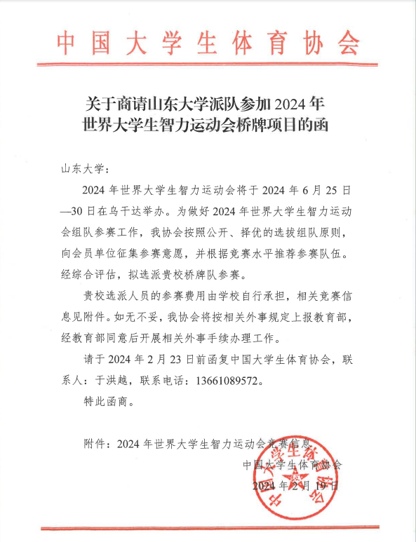 6月25日-6月30日,世界大学生智力运动会将在乌干达恩德培举行,经过中国大学生体育协会的综合选拔,beat365中文官方网站桥牌队获得参赛资格,作为桥牌项目的唯一一支中国代表队,将派出4名运动员参加此次比赛。