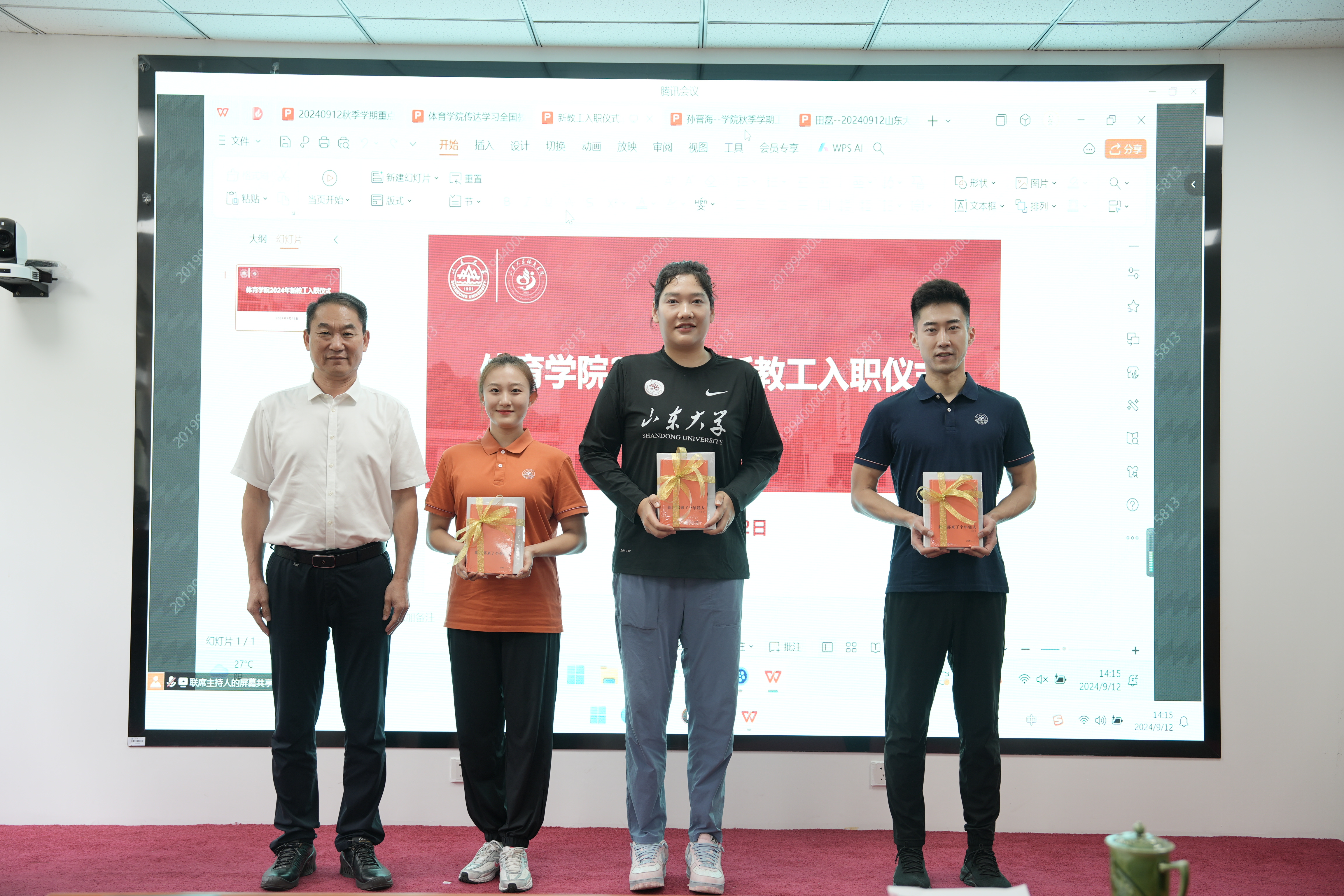 会上还隆重举行了学院2024年新教工入职仪式,孙晋海院长为新入职老师们赠书。新聘教师李玥老师代表发言,表示将深入学习领会“教育家精神”的深刻内涵,牢记育人初心使命,认真开展教学研究,全身心投身到学校体育事业中来,传承好山大体育的优良传统,为体育强国建设、学校全面图强贡献一份力量。