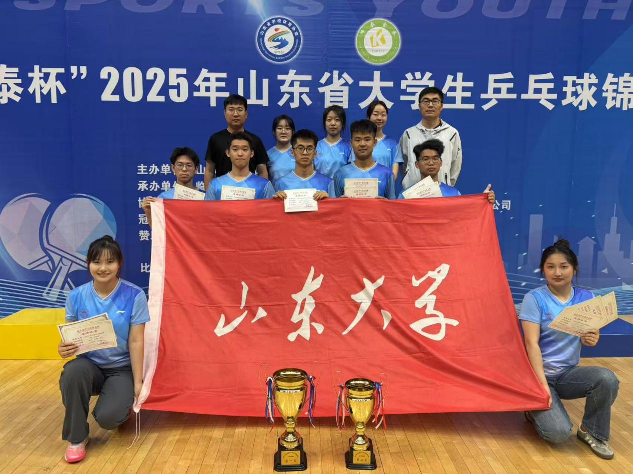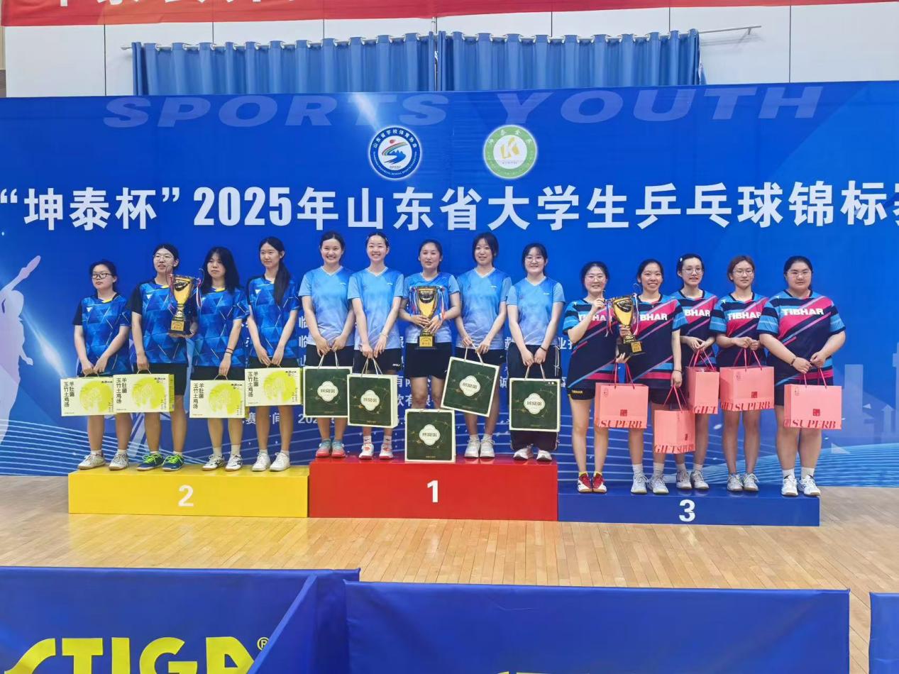5月23日,2025年山东省大学生乒乓球锦标赛在临沭县蛟龙航空主题公园圆满收官。beat365中文官方网站乒乓球队的10名队员经过顽强拼搏,获得甲组2金1铜,首次夺得甲组总成绩第一,实现了历史性的重大突破。同时,教练李海鸣、陈德旭凭借出色的带队表现荣获“优秀教练员”称号。