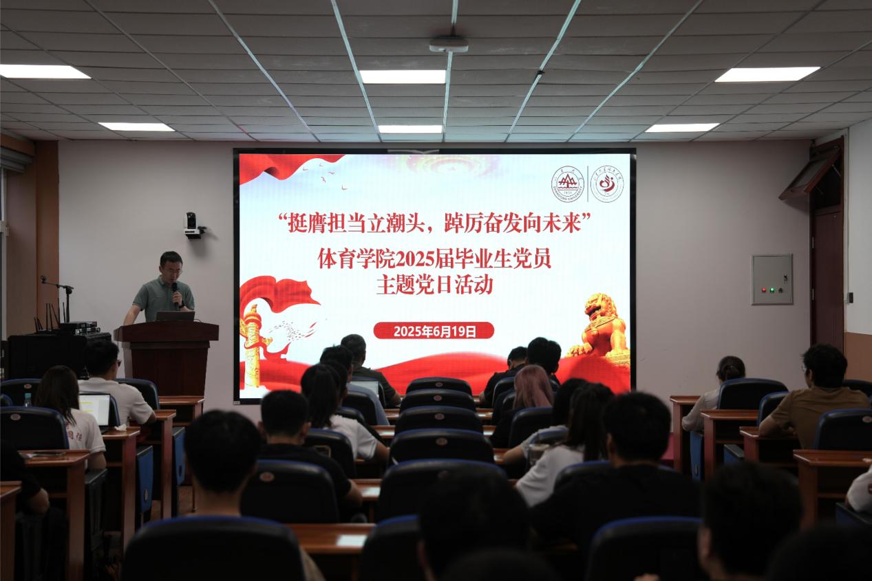 活动伊始,在2025届本科毕业生张长志领誓下,毕业生党员重温入党誓词,新党员庄严宣誓,铿锵誓言凝聚信仰力量。随后,2025届研究生毕业生代表吴沁玫、本科毕业生代表周士森发言,分享成长感悟与未来期许,展现毕业生党员担当。田磊为毕业生党员讲授离校前最后一次党课,从时代使命切入,激励党员在民族复兴大业中,以体育人、挺膺担当,实现个人价值。卢士涌强调毕业生党员要站好文明离校“最后一班岗”,以实际行动诠释党员模范作用,传承学院精神。最后,范泽斌部署毕业生党员离校相关工作,明确党组织关系转接等事宜,解答疑问,助力党员顺利完成组织衔接。