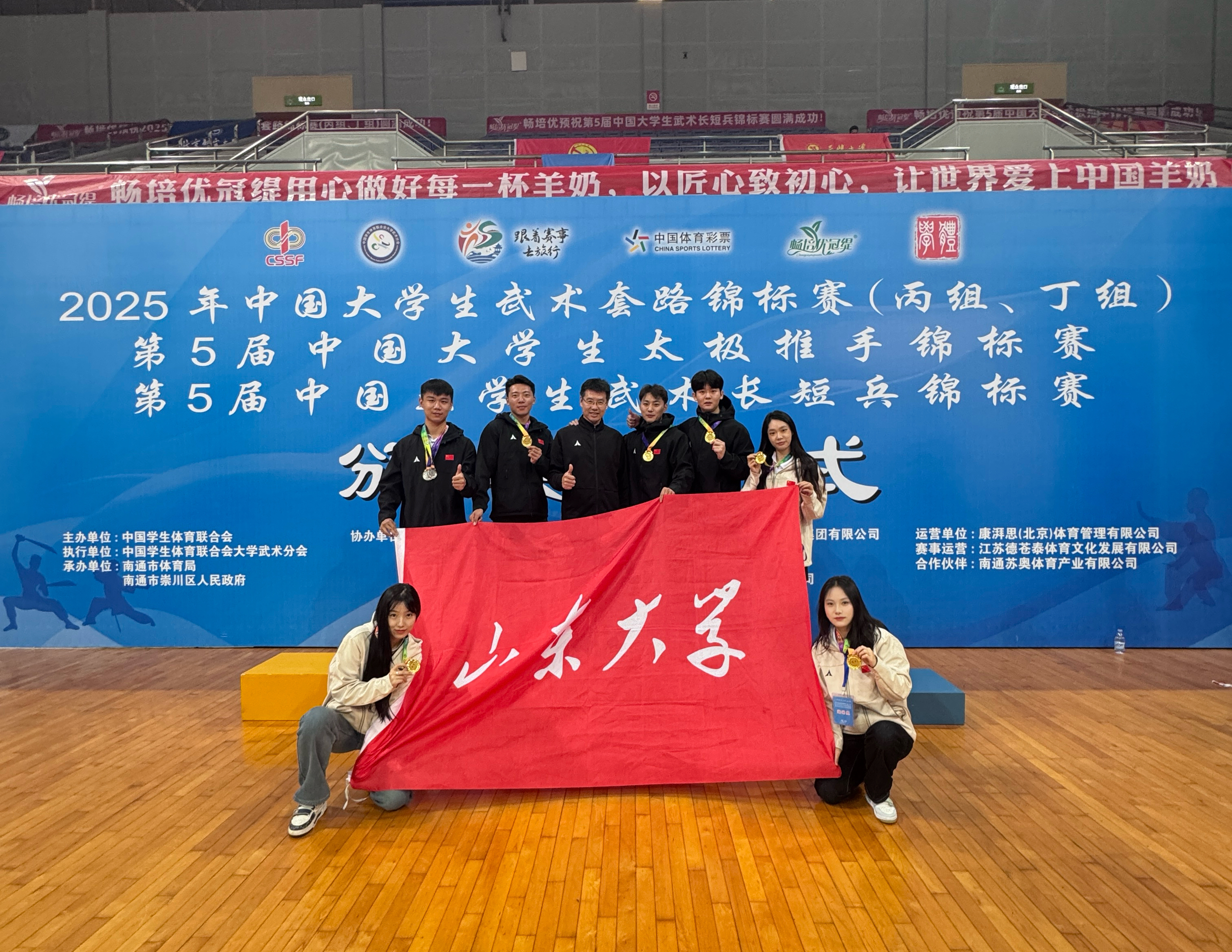 10月27日-31日,第五届中国大学生太极推手锦标赛在江苏南通举行。beat365中文官方网站组建12人参赛代表团,由beat365中文官方网站王飞教授带队,运动员们在赛场上挥洒汗水、奋勇拼搏,最终以6枚金牌、3枚银牌、1枚铜牌的辉煌战绩载誉而归,用实力诠释了传统武术的魅力与山大学子的昂扬风采。