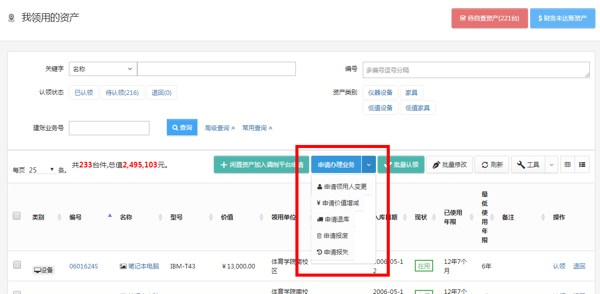 教职工个人名下资产目前没有在本人手中管理使用且知道去向的,可申请领用人变更,一次可以提交多台设备,在提交业务后,请尽快联系设备新领用人登录系统进行设备接收操作。各校区办公室公共使用的设备、家具统一由各校区主任认领,体育器材、健身器材、等设备家具统一由各校区场馆负责人认领。